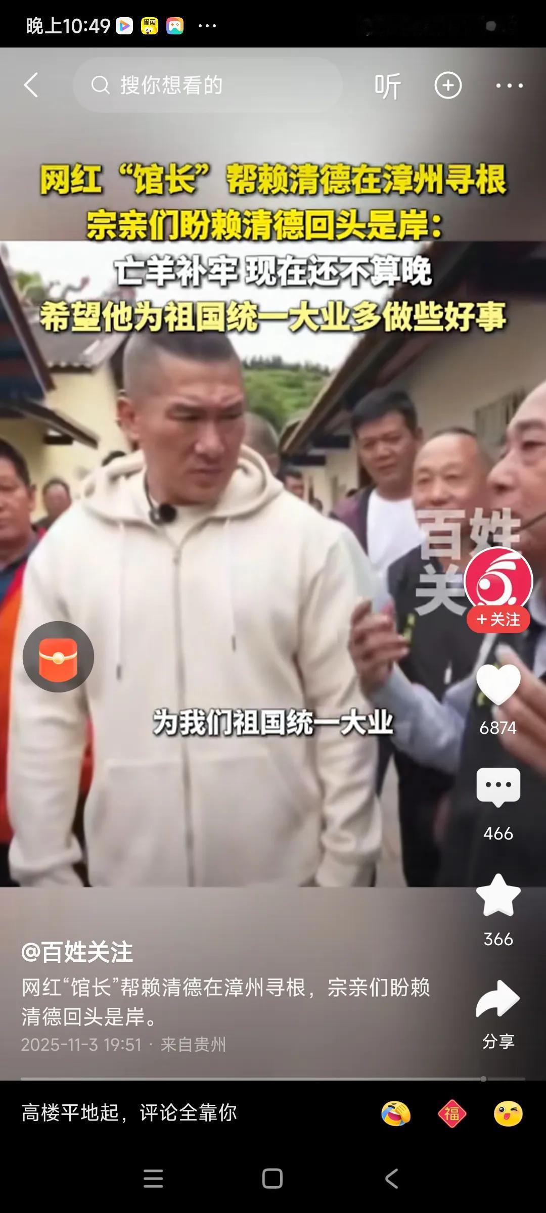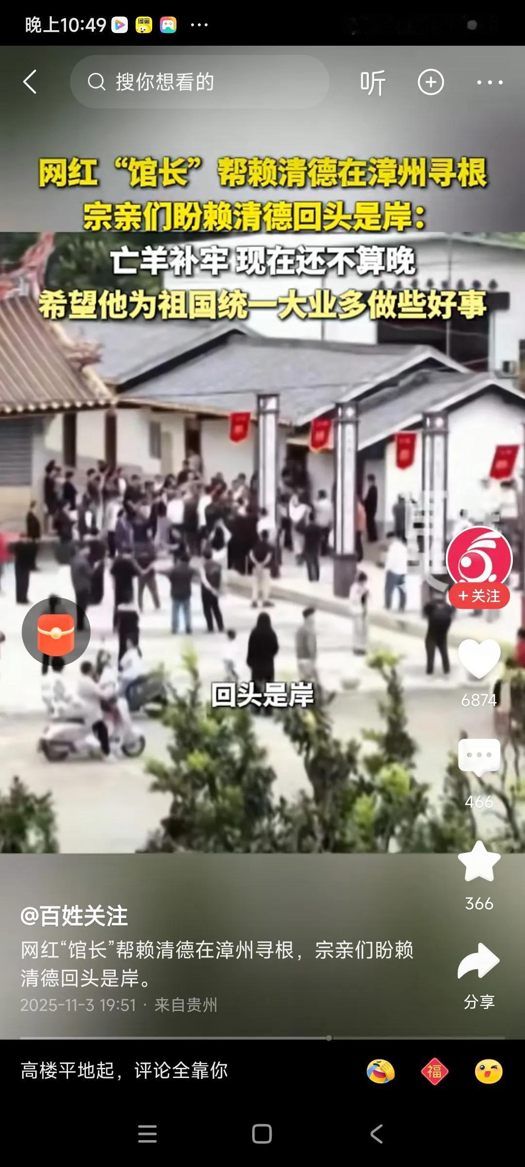 台湾网红馆长是个热心人,虽然赖清德不承认自己是中国人,他骨子里媚日亲美,但是馆长还是不放弃他,帮他寻根,去赖清德的家乡漳州参观,, 家乡人民永远是最包容的,劝赖清德亡羊补牢,回头是岸,为祖国统一做贡献! 不知赖清德看了这些,有何感想,,[捂脸][捂脸] 估计他满脑子都是台独想法,亲日媚美,早己把家乡人民抛到九宵云外去了,忘了老家的父老乡亲了,,,