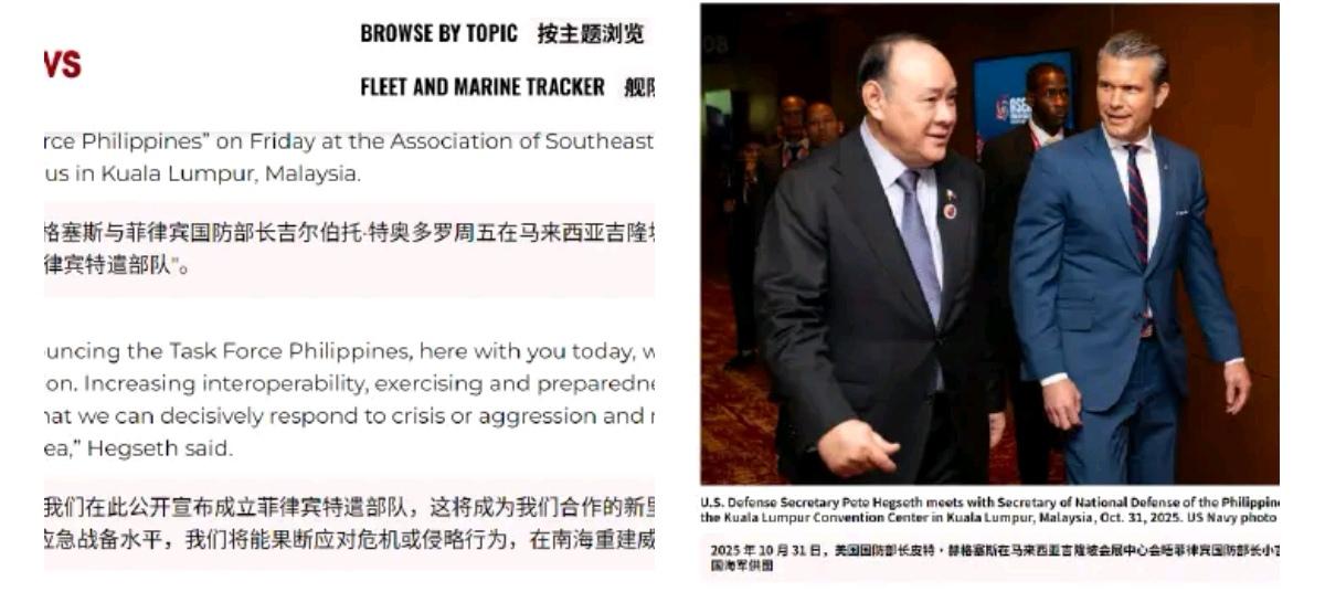 🔻美国国防部长皮特·赫格塞斯与菲律宾国防部长吉尔伯托·特奥多罗周五在马来西亚吉隆坡举行的东盟防长扩大会议上联合宣布成立“菲律宾特遣部队”。 🔻目的依然是“对抗东大”。 🔻美国太平洋舰队在早前发布的声明中称:“菲律宾特遣部队由约 60 名军事人员组成,由一名一星将军或海军将官领导。”