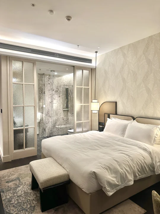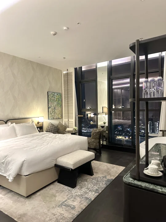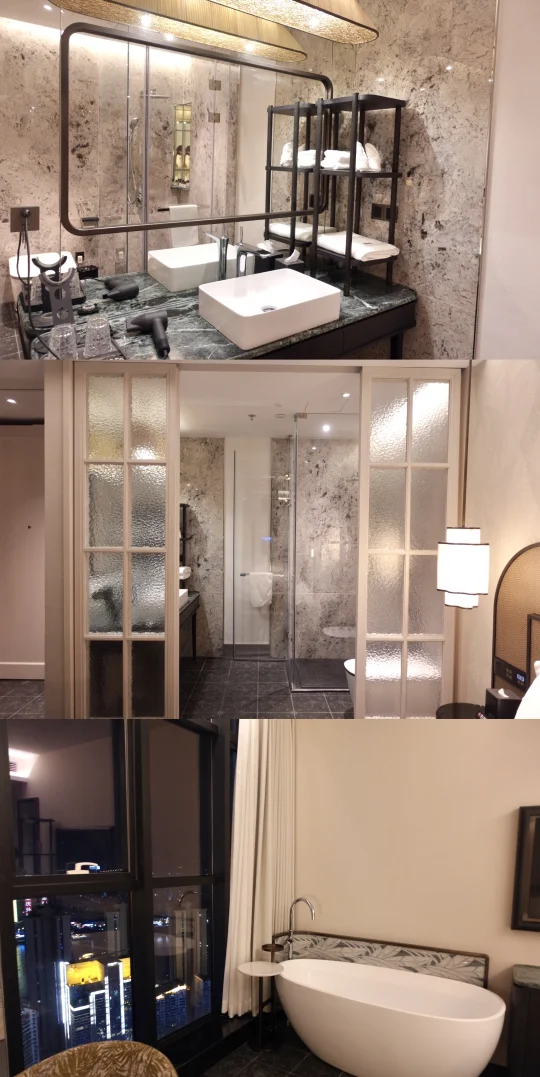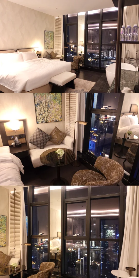 我们订的房间落地窗正对两江交汇,白天看江景,夜晚看霓虹,床品很舒适,躺上去像在云里打滚~最爱窗边浴缸,边泡澡边俯瞰山城,太享受啦!