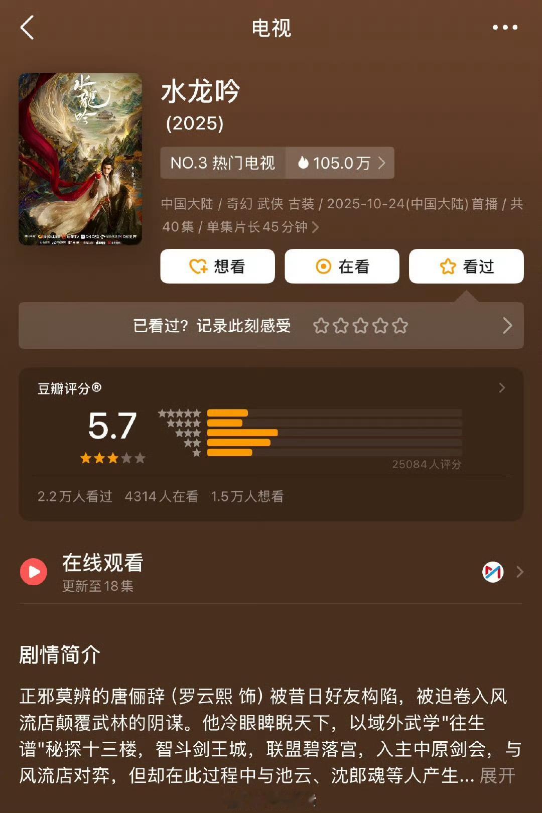 罗云熙水龙吟豆瓣开分5.7分,打分人数2.8万,3、2、1🌟比例比较高 你觉得水龙吟这个分数高了还是低了呢?[思考]水龙吟暗河传豆瓣开分