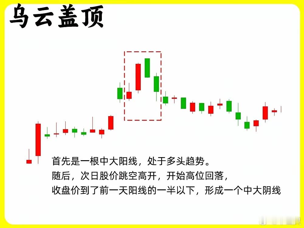 在上涨趋势的末期,首先是一根中大阳线,处于多头趋势。随后,次日股价跳空高开,开始高位回落,收盘价到了前一天阳线的一半以下,形成一个中大阴线。就是乌云盖顶形态。这个有一个细节,就是次日出现高开,这是主力的一个假的突破,成交量越大,说明此时抛压会更大。如果需要这样的形态走势,那一定要注意了