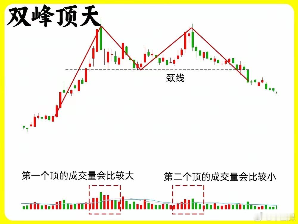 股价经过一波上涨以后,在高位形成两个顶点,而且这个两个点的位置基本相同,就形成了双峰顶天,我们也叫他M顶。第一个顶的成交量会比较大,第二个顶的成交量会比较小,两个山峰的最低点,也就颈线,也是形态里,最为重要的一个点位。其实第二顶的阶段,其实就是主力的偷偷出货,承接力量此时比较弱,所以成交量才会比第一个要低