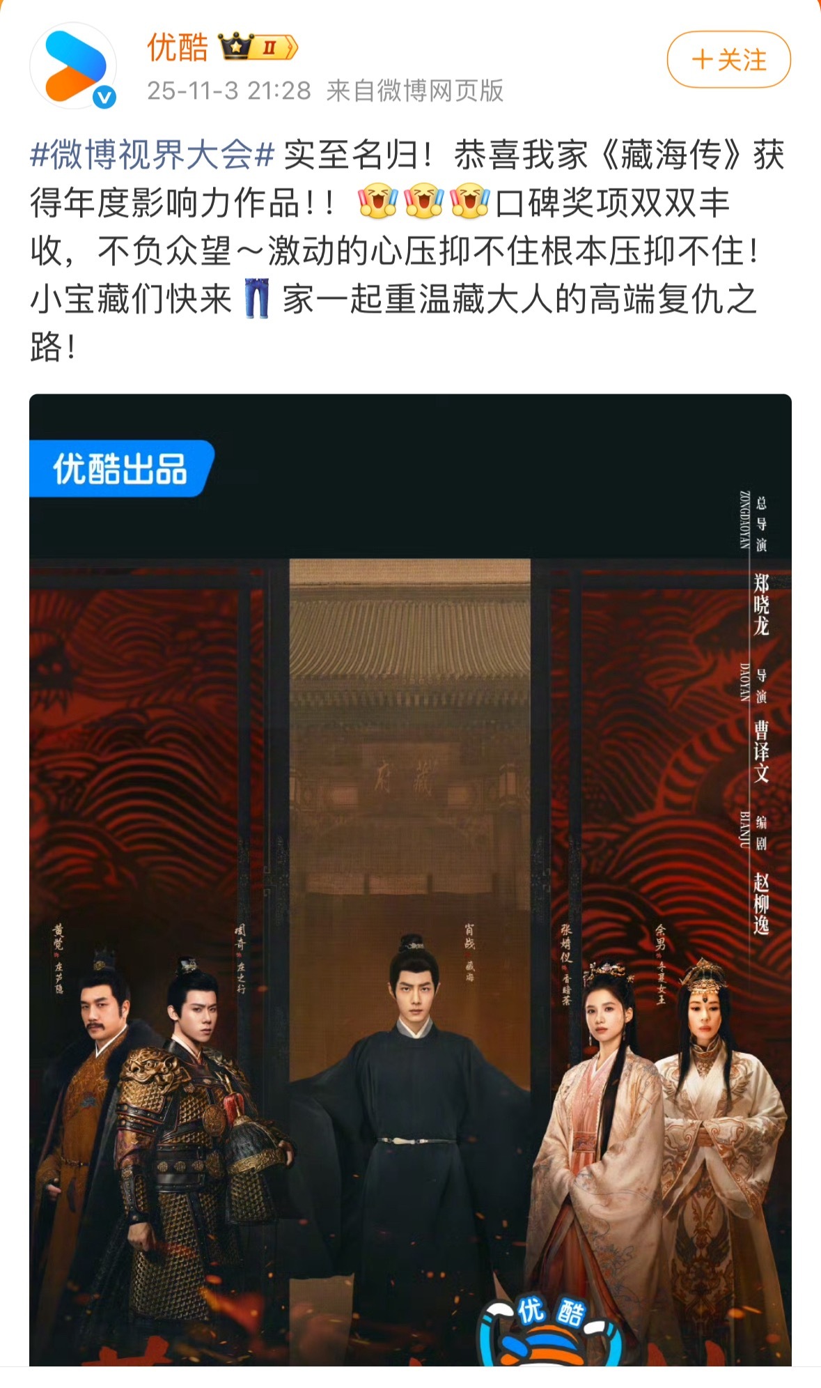 恭喜藏海传获得年度影响力作品,肖战人未到,奖照拿。