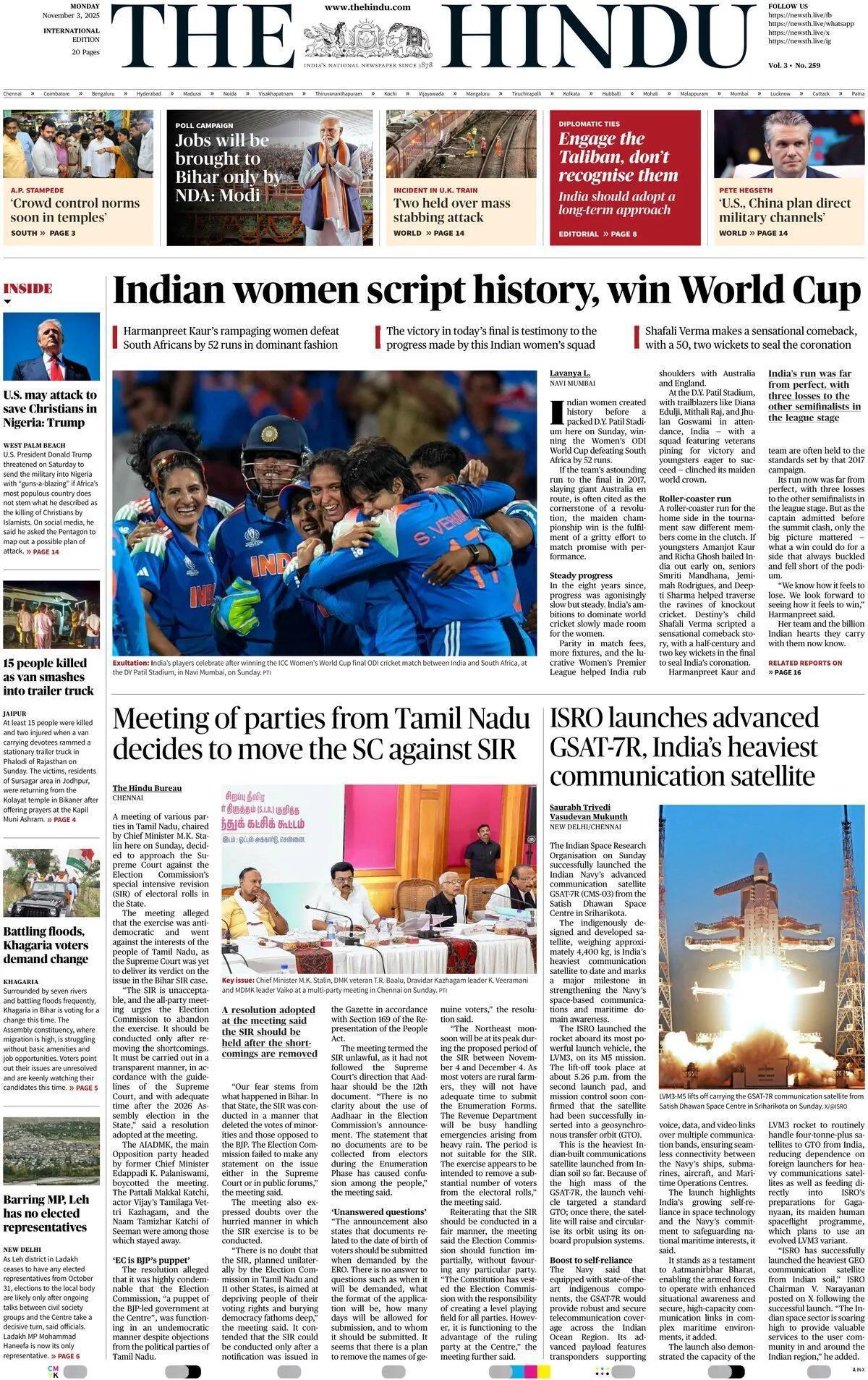《印度教徒报》头版报道称,印度空间研究组织发射印度最重的先进通信卫星GSAT-7R。 印度空间研究组织于周日从斯里赫里戈达的萨蒂什·达万航天中心成功发射了印度海军的先进通信卫星GSAT - 7R(CMS - 03)。 这颗由印度自主设计和研发的卫星重约4400千克,是印度迄今为止最重的通信卫星,标志着在加强海军天基通信和海上领域态势感知方面的一个重要里程碑。 印度空间研究组织使用其最强大的运载火箭LVM3执行M5任务发射了这枚火箭。下午5点26分左右从第二个发射台升空,任务控制中心很快确认卫星已成功进入地球同步转移轨道(GTO)。 这是迄今为止从印度本土发射的最重的印度制造的通信卫星。 由于GSAT - 7R质量很大,运载火箭瞄准了标准的地球同步转移轨道;到达该轨道后,卫星将使用其机载推进系统提升并使轨道变为圆形。 这颗卫星的发射增强自力更生能力。 海军表示,配备了最先进的本土组件后,GSAT - 7R将在印度洋地区提供强大且安全的电信覆盖。其先进的有效载荷具有支持转发器的功能通过多个通信频段实现语音、数据和视频链接,确保海军舰艇、潜艇、飞机和海上作战中心之间的无缝连接。 报道称,此次发射凸显了印度在太空技术方面日益增强的自力更生能力以及海军对维护国家海上利益的承诺。 它是印度自力更生的证明,使武装部队能够在复杂的海上环境中凭借增强的态势感知能力以及安全、高容量的通信链接开展行动, 报道补充道。 此次发射还展示了LVM3火箭将常规地把超过四吨重的卫星从印度发射至地球同步转移轨道(GTO),减少印度在重型通信卫星方面对外国发射器的依赖,同时也直接助力印度空间研究组织(ISRO)为其首次载人航天计划“加甘扬”(Gaganyaan)做准备,该计划打算使用改进后的LVM3变体。 印度空间研究组织主席V. 纳拉亚南在成功发射后于X平台上发文称:“印度空间研究组织已成功从印度本土发射了最重的地球同步轨道通信卫星。” 他还补充道:“印度航天领域正在蓬勃发展,为印度地区及周边的用户群体提供有价值的服务。”