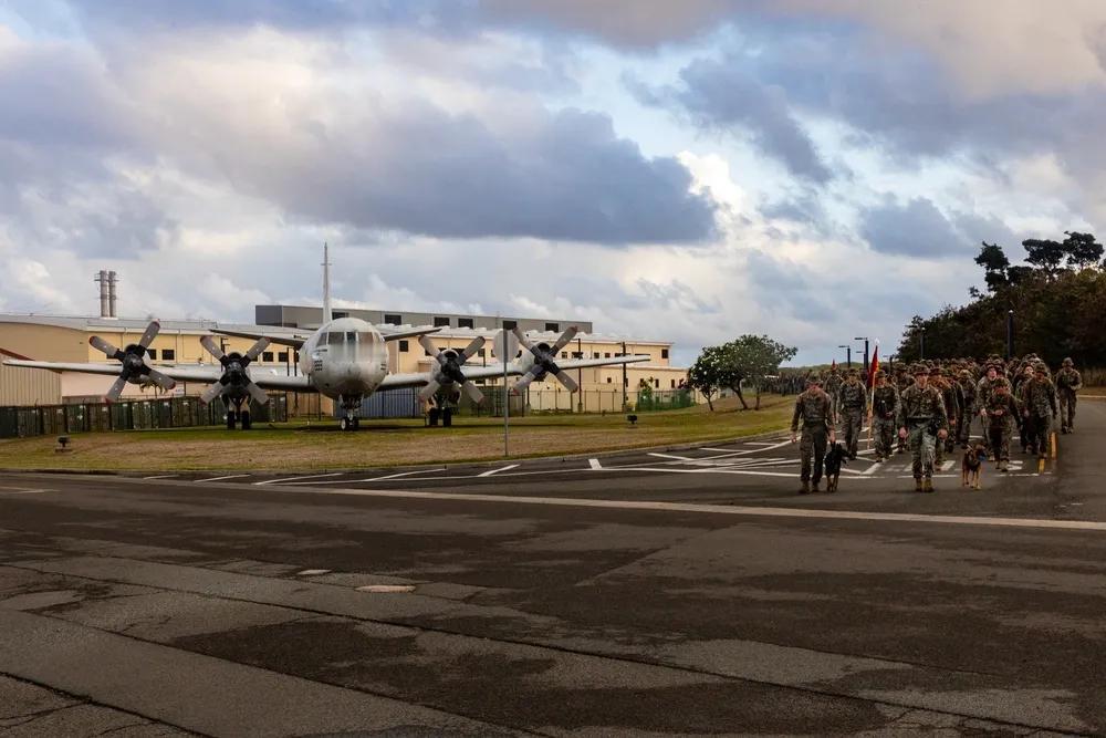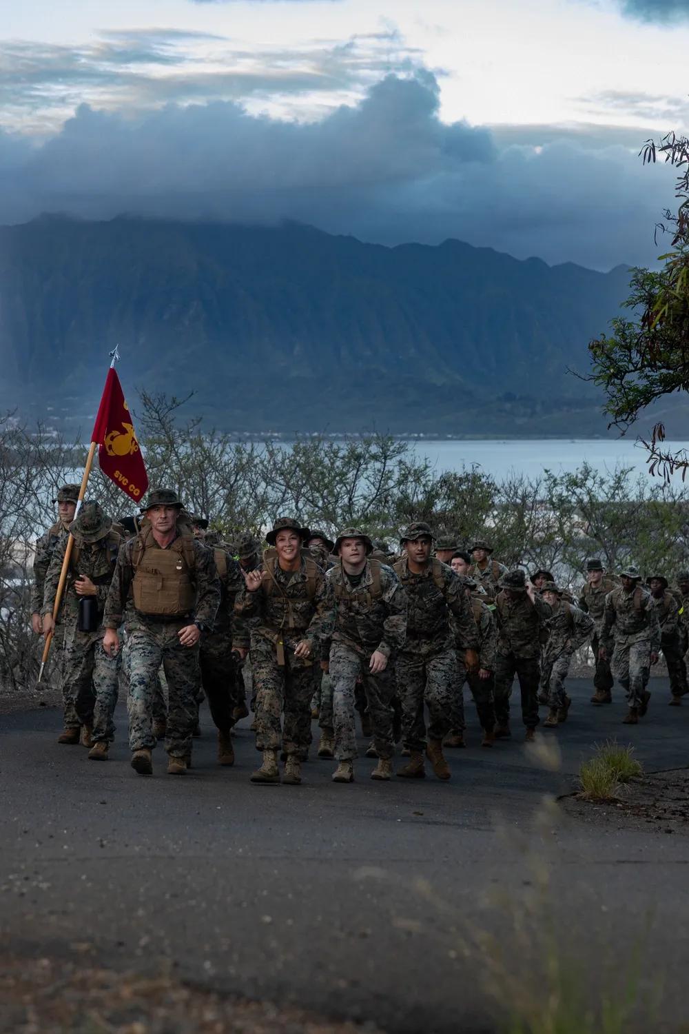 2025年10月28日,夏威夷,美国海军陆战队总部营(HQBN)、夏威夷海军陆战队基地(MCBH)的海军陆战队员于在MCBH进行了一次体能训练远足。这次10公里的远足旨在增强总部营的战斗力和部队凝聚力。