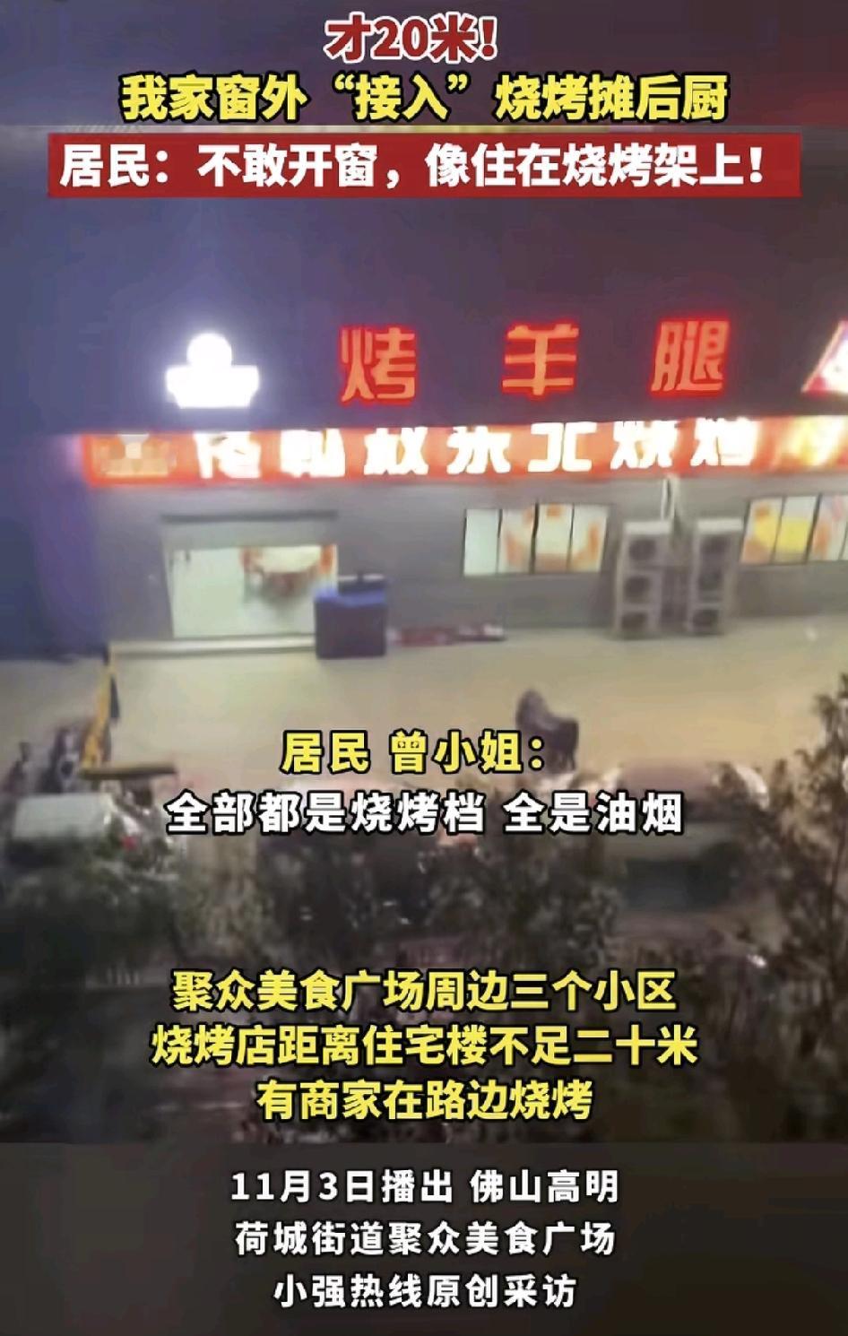 造成高明一美食广场周边三个小区居民投诉。每到晚上,楼下的商店,全是油烟味,有居民反映,自家的厨房就是挨着烧烤摊的后厨,简直就是被支在了烧烤架上一样,完全不敢开窗,除此以外,很多夜宵 time到深夜都是各种噪音,居民纷纷表示自己就是受害者,而商铺表示他们拿了各种牌照就是符合规定的。这些美食广场通常都在市的中心,没有人会愿意把自己的商铺开在没有人流的地方。而小区的居民当初也是看中了各种配套设施。