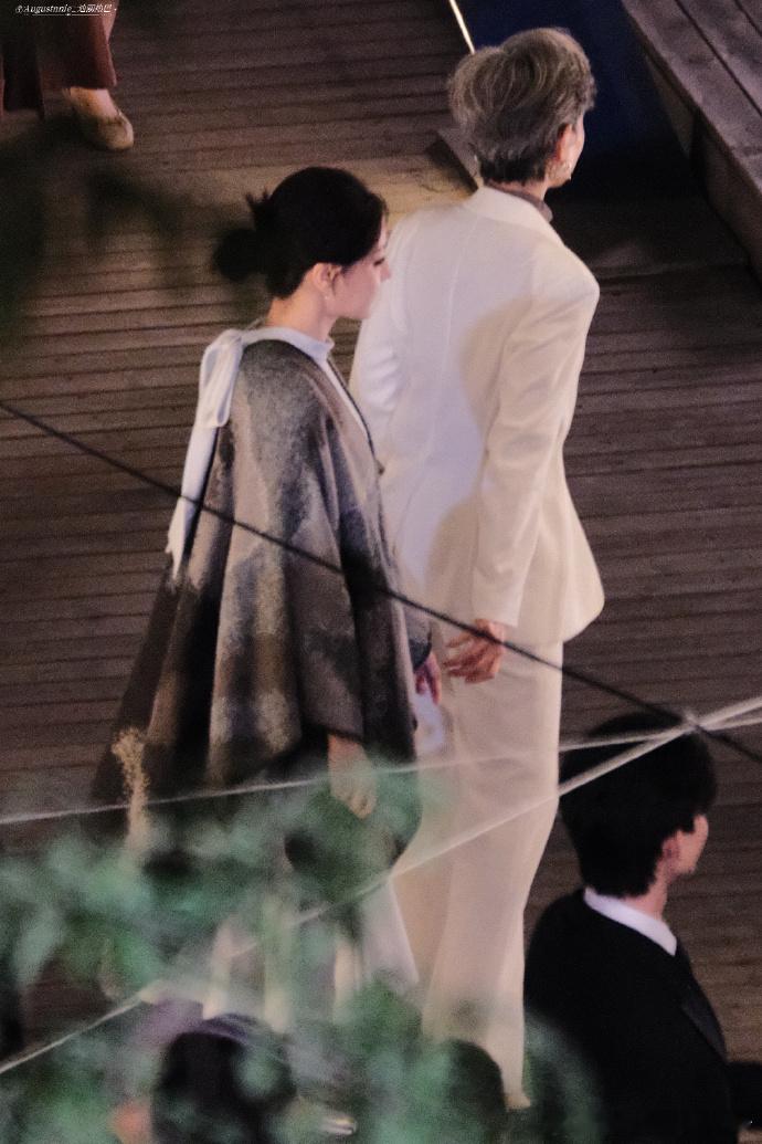 迪丽热巴叶童牵手路透迪丽热巴卫蓝白裙路透白蕾丝与毛绒的温柔,牵住米白西装的从容,