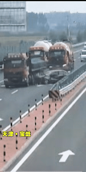 这辆黑色轿车也是无奈,它也想远离大货车,可是现实是它已经被四辆大货车夹击,此刻的黑色轿车是那么的弱小无助。 高速公路上,一辆黑色轿车正在正常行驶,它的前面、后面、左面都是大货车和大罐车,它的右面是栏杆,黑色轿车在四辆大车中间就像一个玩具车,危机四伏。 这时,黑色轿车左面的大货车突然右侧变道,无视右面行驶的黑色轿车,把黑色轿车撞的转了一圈才停下来。 这个交通事故大货车全责无疑,黑色轿车车主虽然无大碍,但也是心有余悸,下次再在路上行车,一定会离大货车远远的,保持距离才能保障安全。