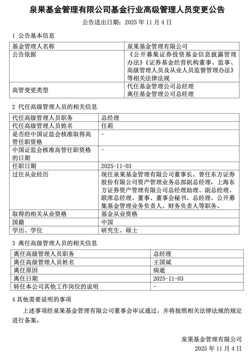 【#泉果基金创始人王国斌离世#】据澎湃新闻消息,泉果基金管理有限公司(简称“泉果基金”)创始人、总经理王国斌,因病医治无效,于2025年11月3日不幸逝世,享年57岁。泉果基金于11月3日16:02发布讣告称,对王国斌为公司创建和发展所做出的巨大努力和卓越贡献由衷感谢,对他的离世表示沉痛哀悼。11月3日,泉果基金公告称,王国斌因病逝离任,公司董事长任莉代任总经理职位,变动日期为2025年11月3日。