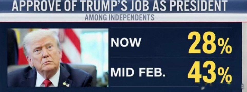 美帝数据,在中立群众当中,美国特朗普总统的支持率大幅下降。