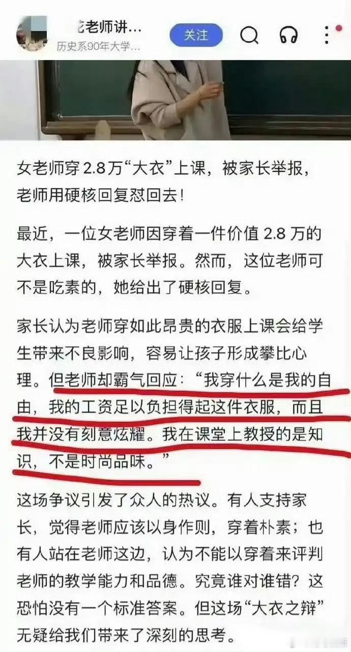 女老师穿2.8万元大衣上课,被家长举报后,老师硬核回怼,有理有力有节。