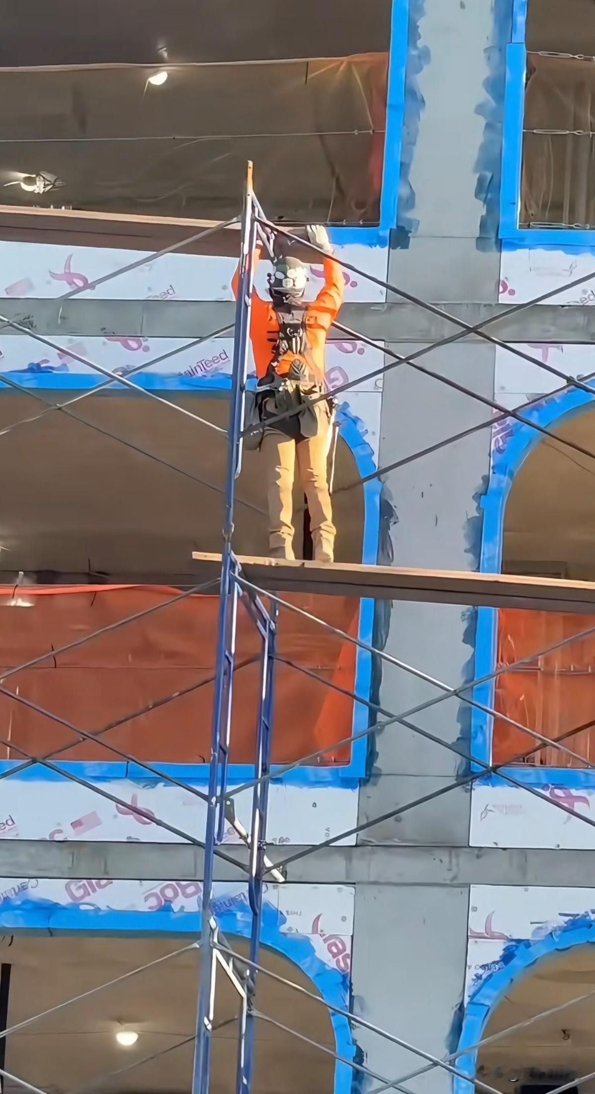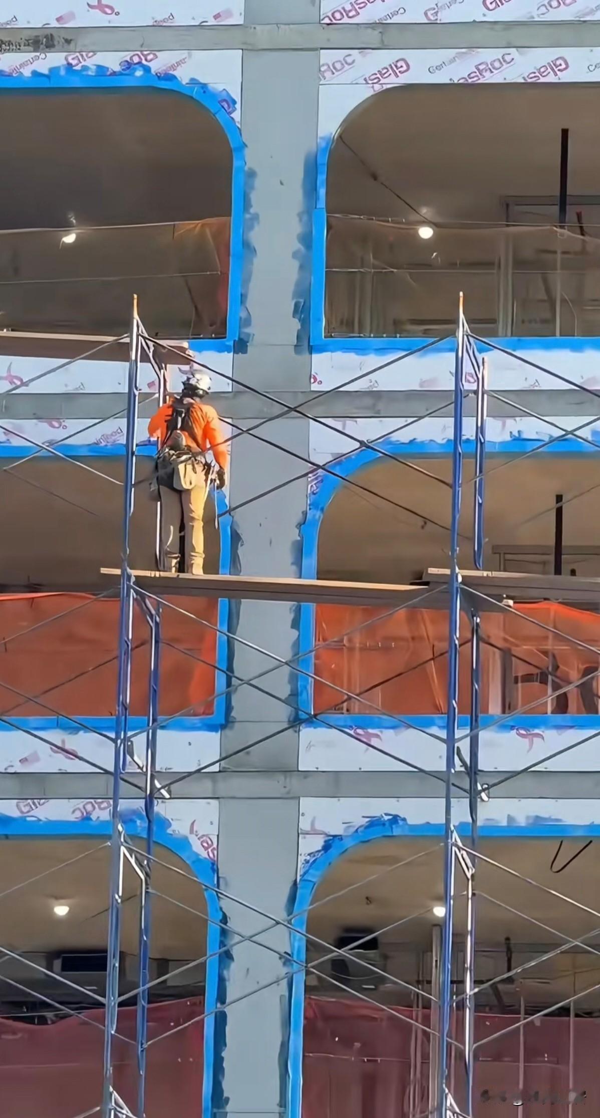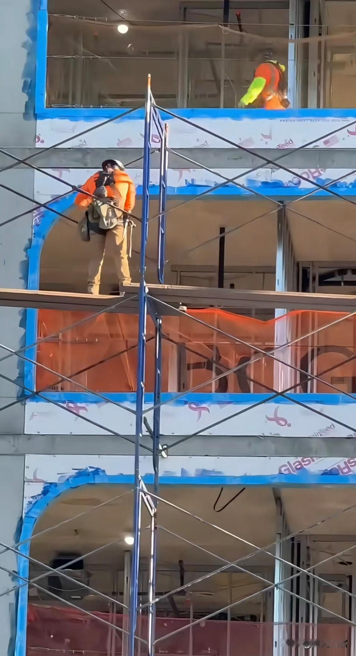 虽然我不懂建筑施工,但是看到美国纽约这个施工架子,感觉还是有点震惊。工人没有做安全措施,比如用安全绳绑定。架子没有围栏,也没有跟大楼外墙之间做链接。工人直接站在高空,不做任何防护就搭那么重的木板,感觉好“任性、随意”。