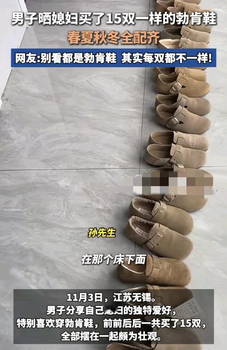 天中五是一男子分享了自己妻子春夏秋冬一共购买了15双的勃肯鞋,全部摆放在一起,感觉看上去差不多的鞋子,不知道妻子为什么会这么专一的喜欢一款鞋子,我肯鞋也是这两年非常流行的鞋子,主要是容易搭配。穿着舒服,通勤,户外旅游都是很百搭的鞋子,不过也有网友指出自己一双都不会买这样的鞋子,主要就是因为这一款鞋子香的人不够立体。不过穿搭就是要看个人的喜好,也要根据个人的气质,穿衣风格来选购。