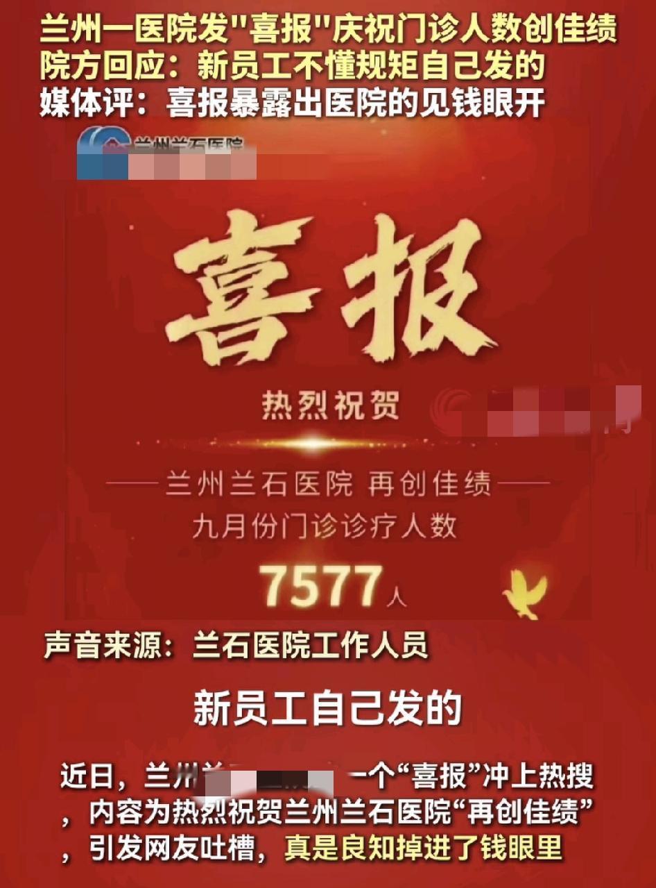 兰州一家医院发布的喜报冲上了各大平台的热搜,喜报的主要内容是庆祝医院门诊人数达标了,医院本来是救死扶伤的场所,为患者解除疾病的困扰,这样的喜报,让人看着医院就是把一份责任心放在了钱眼里。等医院的回复确认,表示这样的喜报是新员工做的,不懂规矩,网友们质疑,新员工哪有权利去发喜报,新员工只有整理头尾的份,干最苦的活,这样的喜报就是有一定资历的员工来发布的。