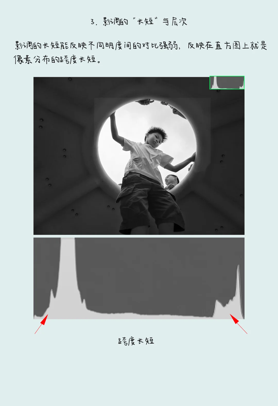 影调的 “长短” 反映不同明度间的对比强弱,可通过直方图(像素分布跨度)判断: