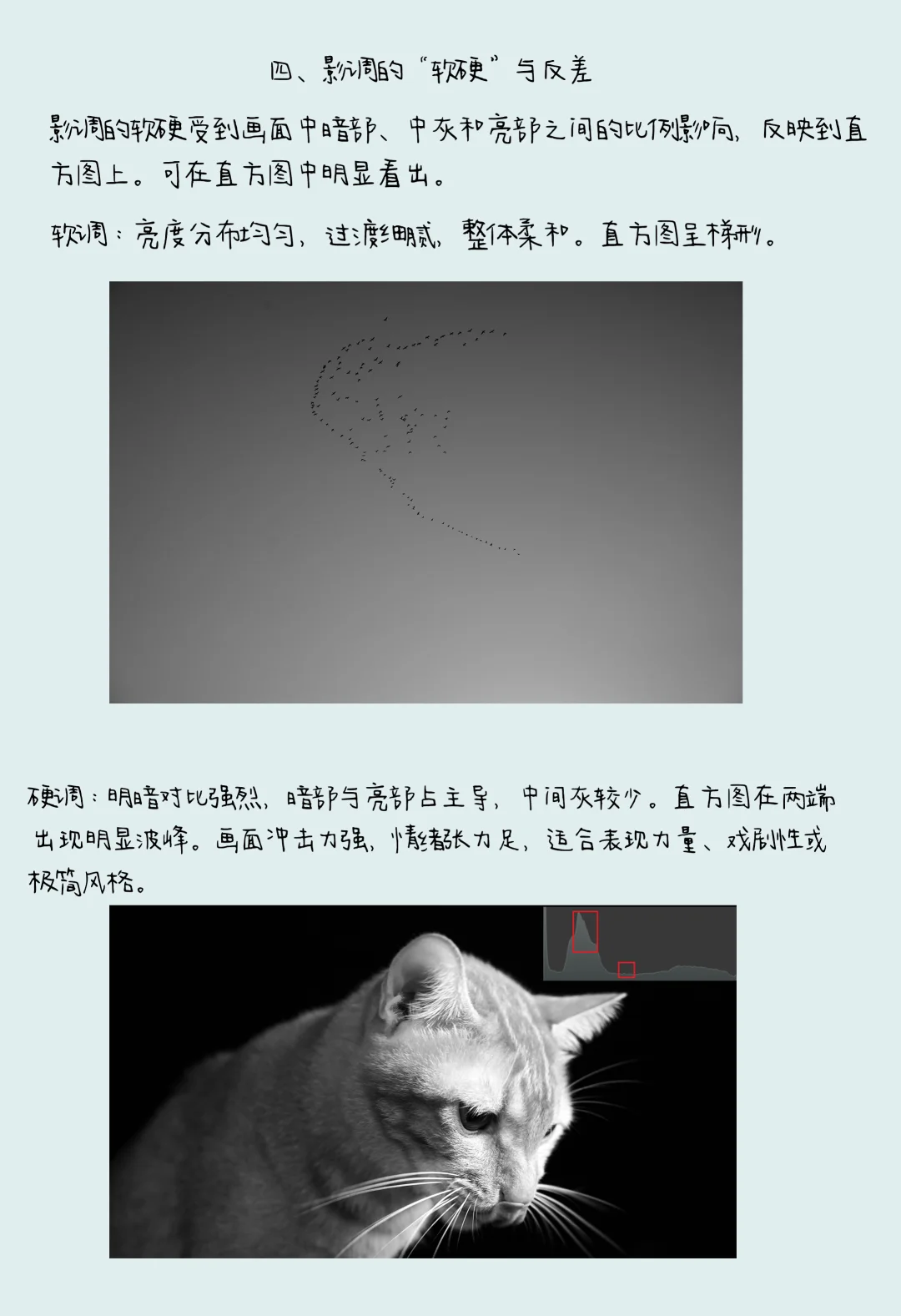 影调的 “软硬” 受暗部、中灰、亮部比例影响,在直方图中特征明显:
