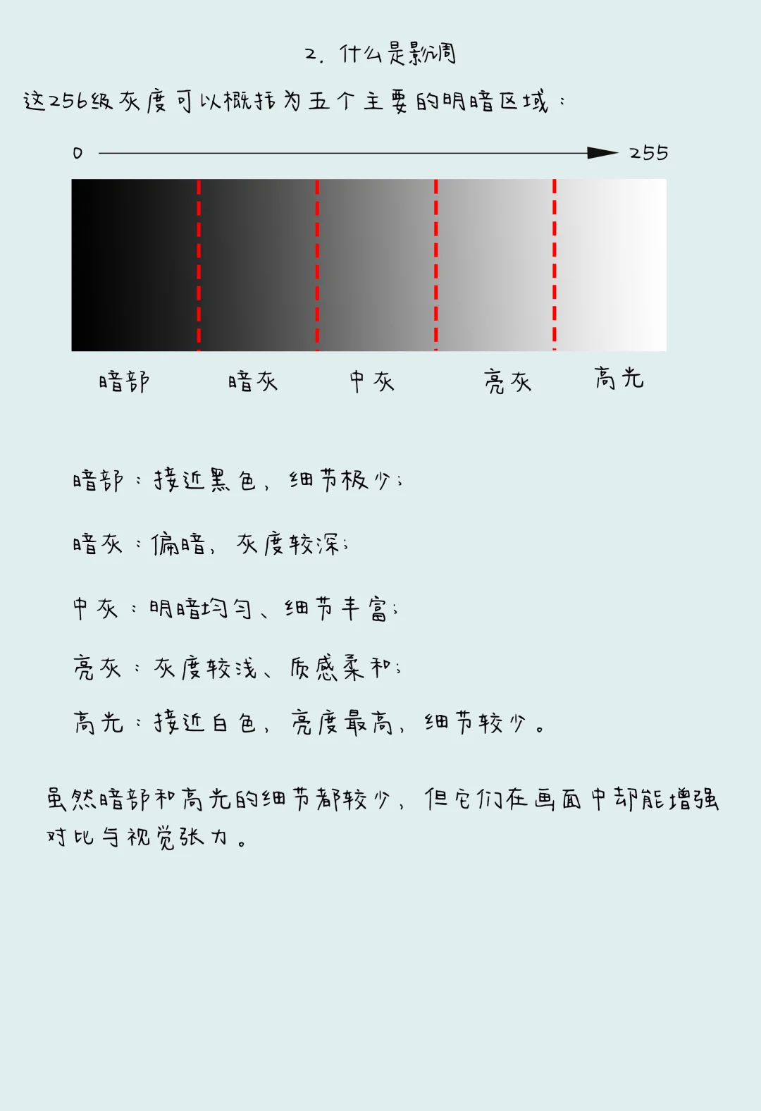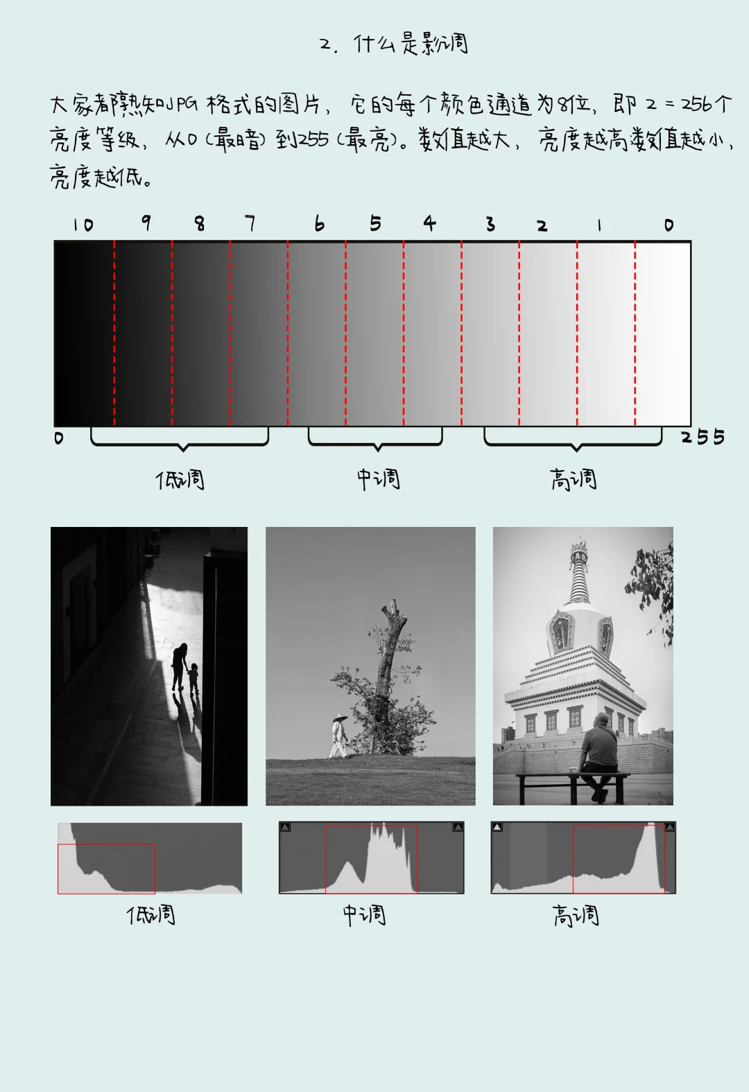 日常使用的 JPG 格式图片,每个颜色通道为 8 位,对应 256 个亮度等级(0 为最暗,255 为最亮),可概括为五个主要明暗区域: