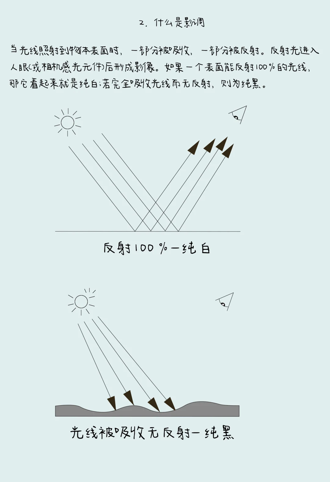 光线照射物体时,部分被吸收、部分被反射,反射光进入相机感光元件形成影像。完全反射光线的表面呈纯白,完全吸收则为纯黑。