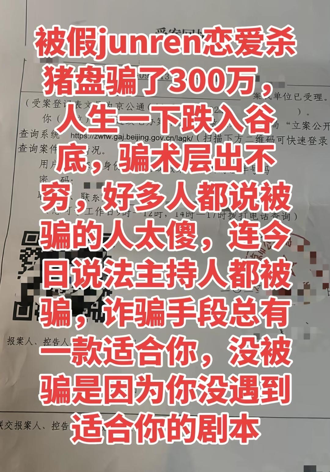 谨防假冒“jun人”“情感陷阱”诈骗 ,被诈骗300万[发怒] 诈骗详情(如下图): 全国各地天天都在宣传防诈骗知识,为什么还有很多人被诈骗? 是骗子手段太高明?还是我们太好骗? 防诈骗顺口10条要牢记 1.陌生来电要警惕,中奖退税是骗局。 2.短信链接莫点击,个人信息不外泄。 3.转账汇款多核实,守住钱包别大意。 4.客服退款要小心,自称公检法是陷阱。 5网恋甜言别轻信,投资赚钱是幻影。 6.验证码是保命符,给钱给码准是输。 7.不轻信、不透露、不转账。 8.遇到疑惑别慌张,拨打110来帮忙。 9.贪小便宜吃大亏,守好钱财不吃亏。 10.天上不会掉馅饼,谨防诈骗时刻记。 你们都记住了吗?防诈骗要记牢啊! 友友们,你们负责貌美如花, 也要负责守好钱袋子啊。 高额骗局 新型骗钱套路 退伍军人骗局 爱国骗局 身份信息诈骗 中国十大骗局 五百万骗局 老年人情感诈骗 军人诈骗 假军官骗局 军包盘诈骗 兵哥哥骗局 情感诈骗师 你们说被骗的人傻不傻? 我想说不傻,如果傻,他们怎么能赚到那么多钱的?(图片来自抖音,如有侵权,联系必删)