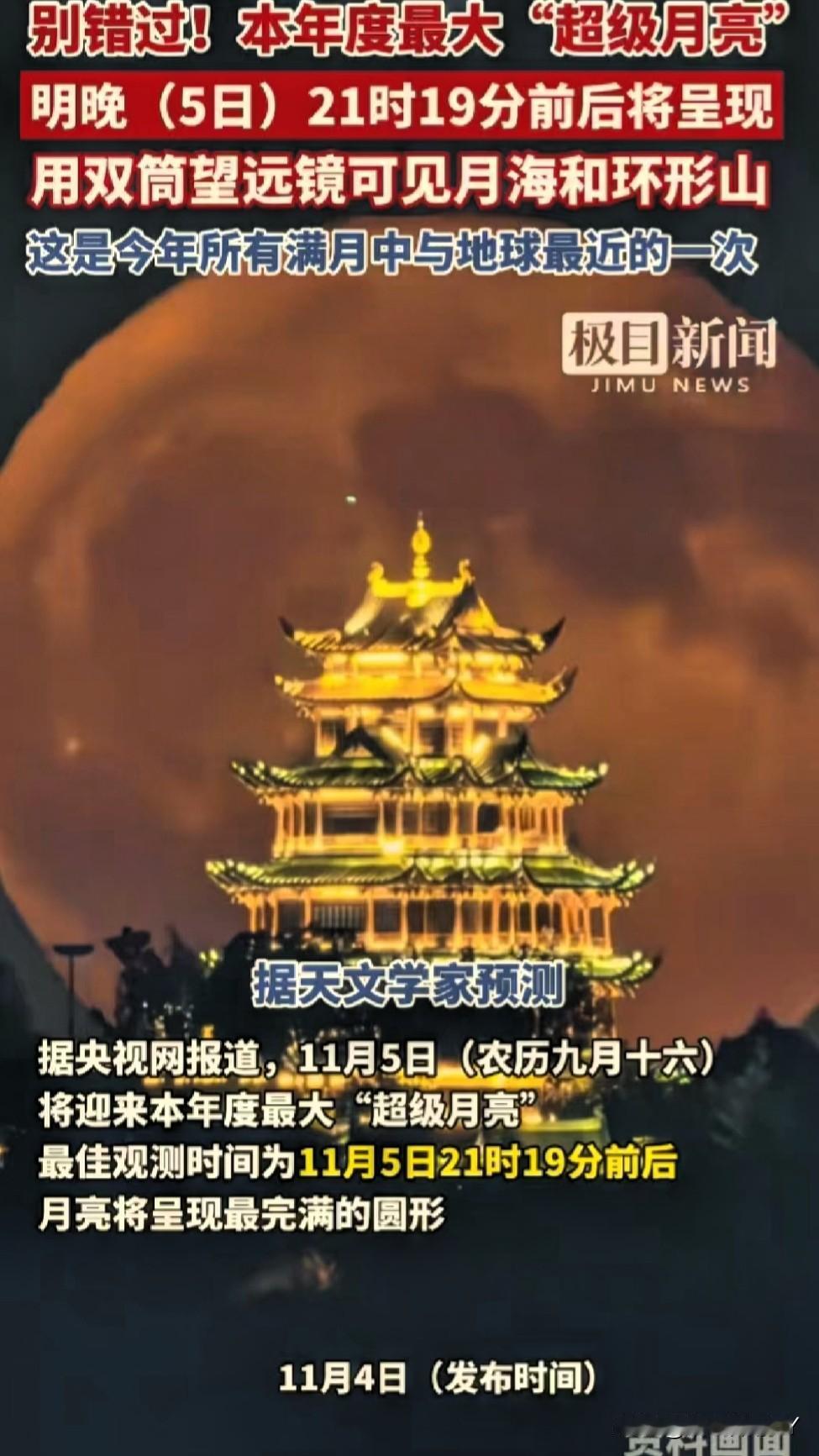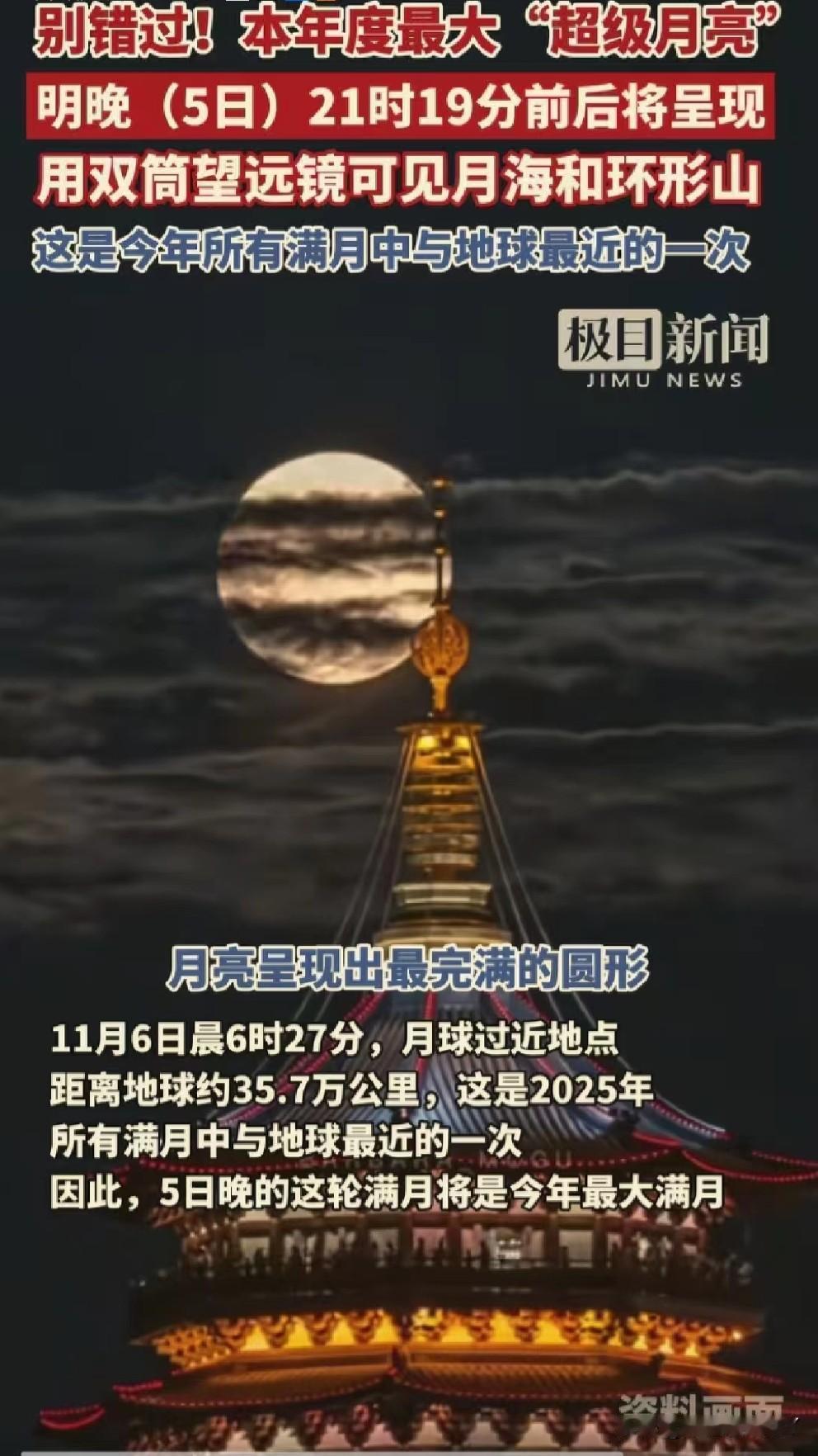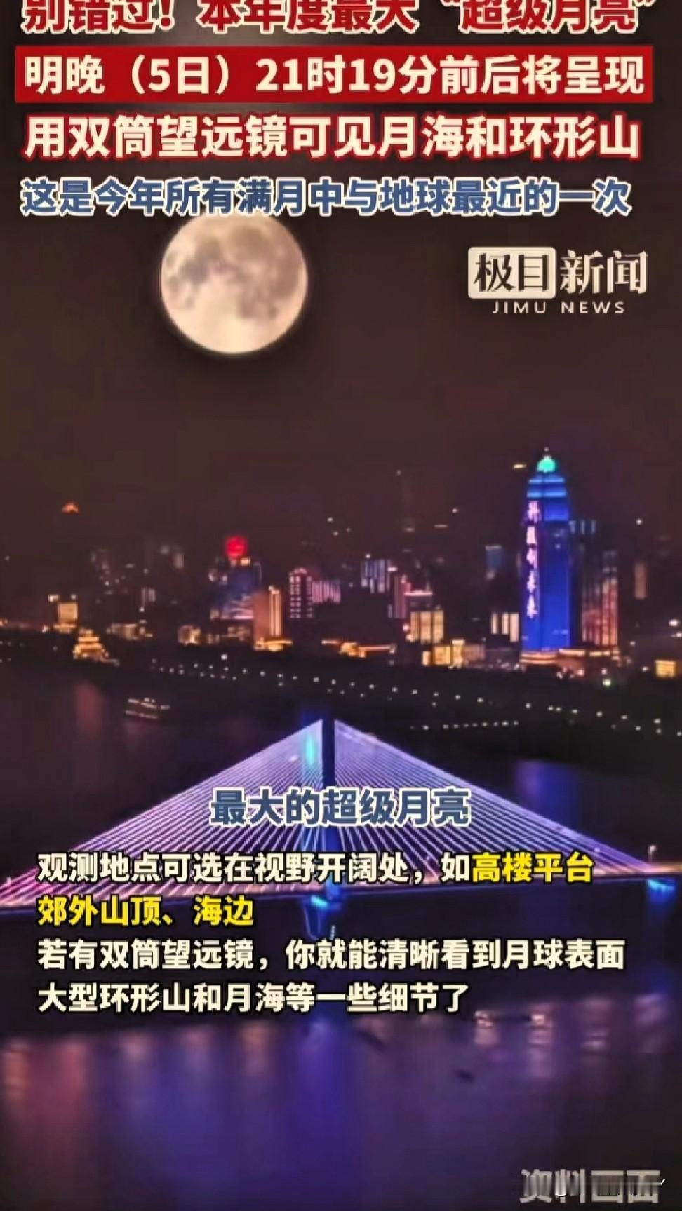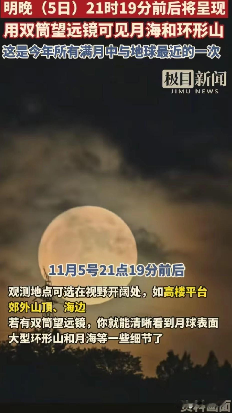 别错过!本年度最大超级月亮明晚登场,快收好这份观测指南。 11月5日,农历九月十六,将迎来本年度最大超级月亮,最佳观测时间为当晚21:19前后。 此次超级月亮是2025年所有满月中与地球最近的一次,月亮会呈现最完美的圆形。 观测地点可选择视野开阔之处,如高楼平台、郊外山顶、海边等。 若有双筒望远镜,还能清晰看到月球表面的大型环形山和月海等细节。 快定好闹钟,明晚一起欣赏这个年度最大的超级月亮吧!