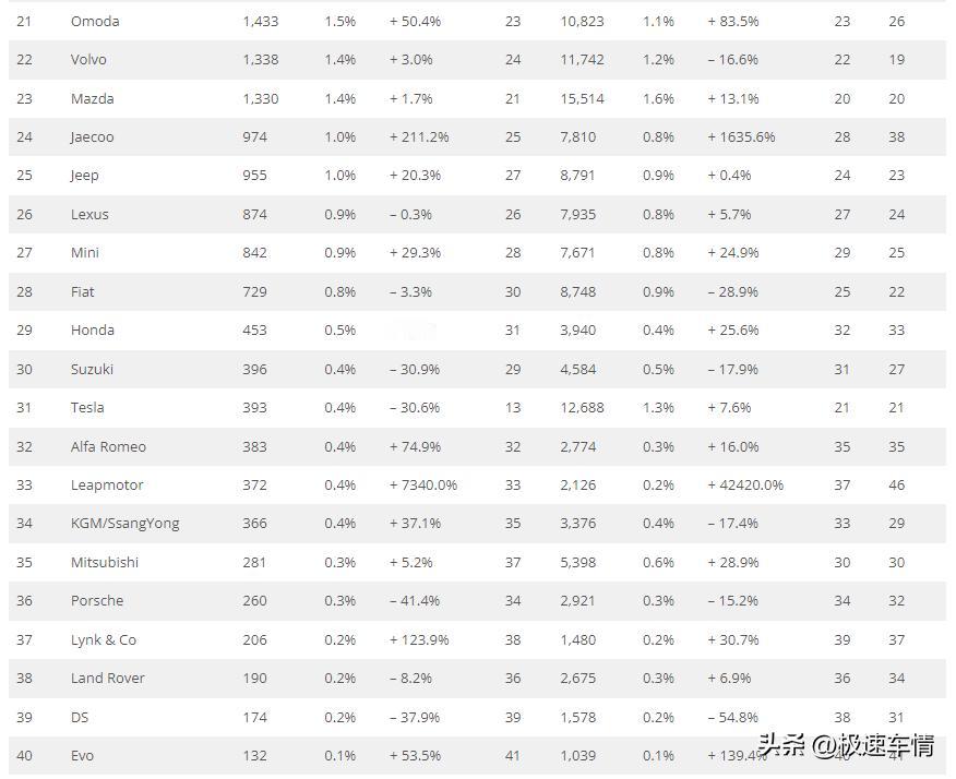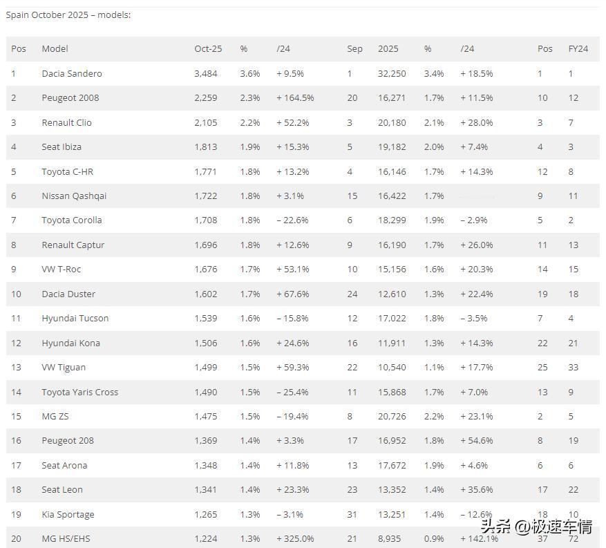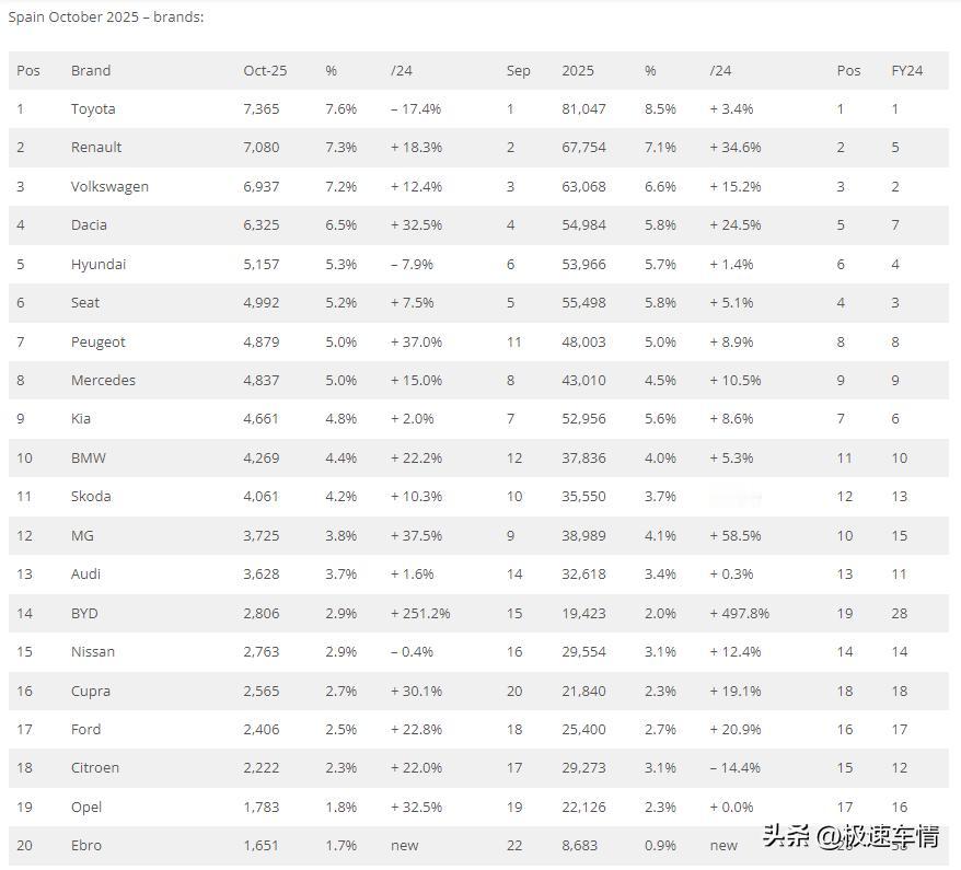 十月,西班牙车市延续高增长,电动化(BEV+PHEV)车型同比激增119%,份额创纪录升至 22.4%,成为核心驱动力。名爵、比亚迪、奇瑞Omoda&Jaecoo乘着西班牙电动化转型的风潮,市占率一路高涨,中国品牌在西班牙市场正在加速渗透,逐渐成为主流品牌。 2025年10月,西班牙新车销量同比增长15.9%,达96,785辆。 2025年1-10月,西班牙累计销量同比增长14.8%,达951,516辆。 名爵(+37.5%):环比下滑3位至第12名,但是市占率依旧保持在3.8%。 比亚迪(+251.2%):连续打破月销量纪录,升至第14。 奇瑞系:新入局的奇瑞Ebro,通过奇瑞收购工厂组装生产,排名第20;奇瑞Jaecoo(+211.2%)、奇瑞Omoda(+50.4%)均实现高增长;奇瑞集团销量4058辆,排名中国车企第一。 中国品牌表现出色: 名爵:3725辆,市占率3.8%。 比亚迪:2806辆,市占率2.9%。 奇瑞Ebro:1651辆,市占率1.7%。 奇瑞Omoda:1433辆,市占率1.5%。 奇瑞Jaecoo:974辆,市占率1%。 零跑:372辆,市占率0.4%。 领克:206辆,市占率0.2%。 SWM:68辆。 小鹏:54辆。 奔腾:36辆。 力帆:28辆。 东风小康:22辆。 东风:18辆。 北汽:5辆。 岚图:3辆。