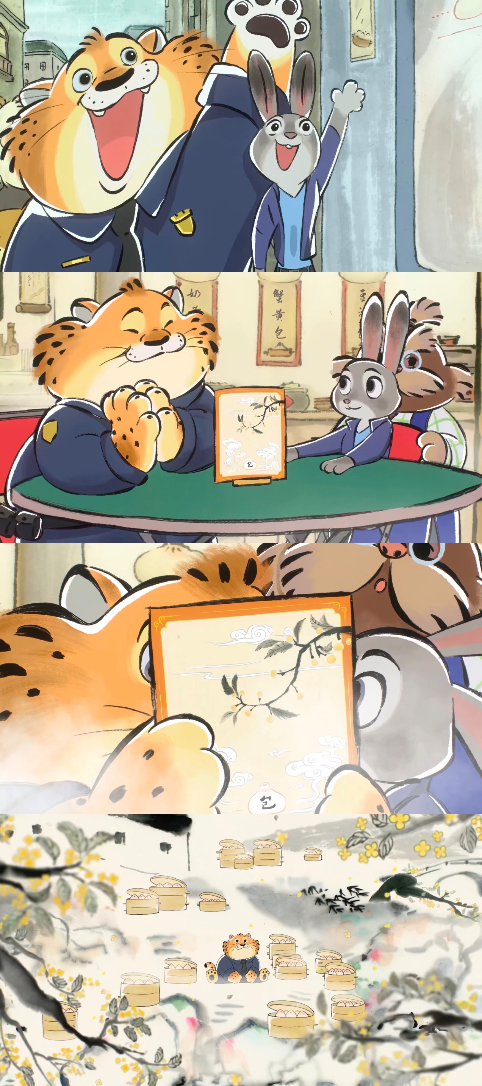 一定要看《豹好吃》,豹子警官和朱迪午休上街打牙祭,排到一家人满为患的包子铺。就在朱迪发愁排队太久的时候,豹子警官吃货基因觉醒,看到顾客的咀嚼便开始对包子的幻想~最后豹子吃到包子,小小咬一口,蟹黄汤汁流出,香味溢出屏幕~水墨画风格寥寥几笔就把豹子警官毛茸茸的样子勾勒出来,加入中式庭院风格,让豹子警官也算当了回我们的金钱豹!上美影好用心,这小短片好看得紧,预热成功,我等不及看《疯狂动物城2》啦!佳片奇遇季