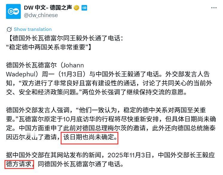 既然德国外长不识抬举,就得这样啪啪打脸!和王毅外长通电话,被咱们外交部直接表明是“应德方请求”,外交辞令中大家一般听过“应约和xx通电话”,显然这次是一点面子不给,直接戳破是你求着我打电话的。 瓦德富尔享受这样的待遇一点也不冤!最近一段时间来,老瓦可是没污蔑指责我们,最近一次发生在10月中旬。在一次纪念德国同日本的友好关系会议上,一边和日本上演哥俩好,一边谴责“中国和俄罗斯正试图改写基于国际法的世界秩序。” ,另外在台湾问题上也常常跳出来指手画脚,一副“教师爷”的傲慢和蛮狠。 关键耍横你得有实力啊,没实力还充大个不是自取其辱吗?本来还想10底访华“就解决稀土或芯片供应等经济问题同中方交换意见”,看你来之前说得那些话,你以为你还能痛快地来?被拒了以后,还不是厚着脸皮“请求”中国接待? 王毅外长在电话里直接“教训”瓦德富尔不要搞“麦克风外交”,你老瓦不还得乖乖听着?而且还得老老实实说出通过密码、表示“坚持一中政策“。然后才得到了允许访问的回复。但是,只说让你来,可没说让你啥时候来!换句话说,就是等通知、看表现。看你还敢不敢装,懂不懂事。 对这些不知今夕何夕,还活在过去的“骄傲”里的不开眼的老欧洲们,就得这么治。爽!