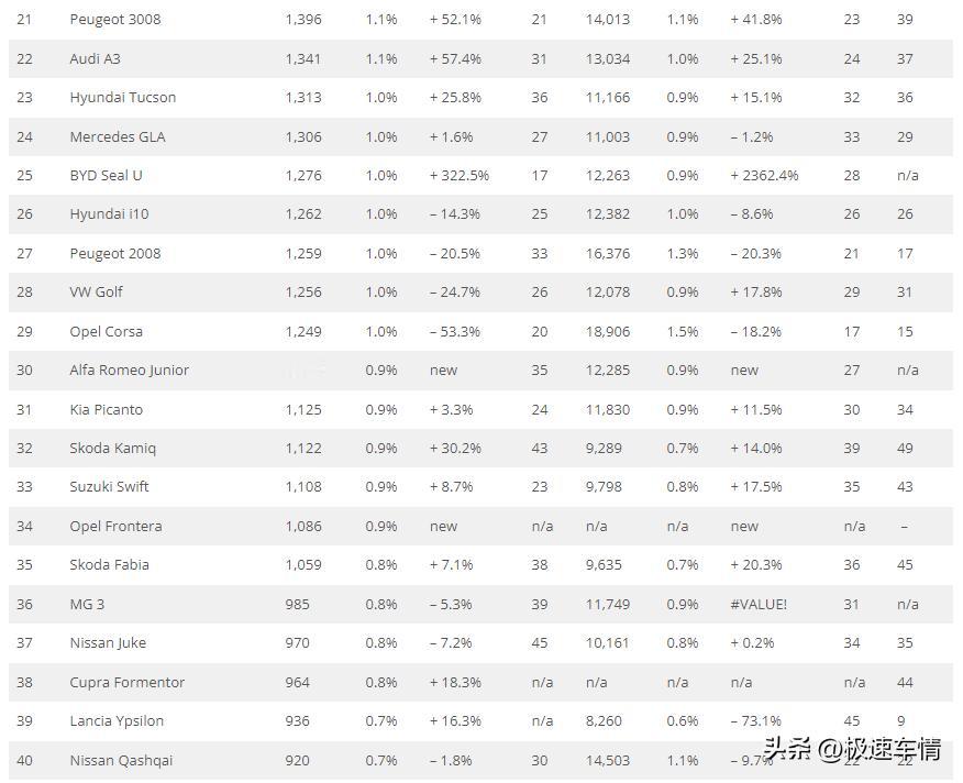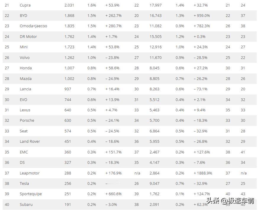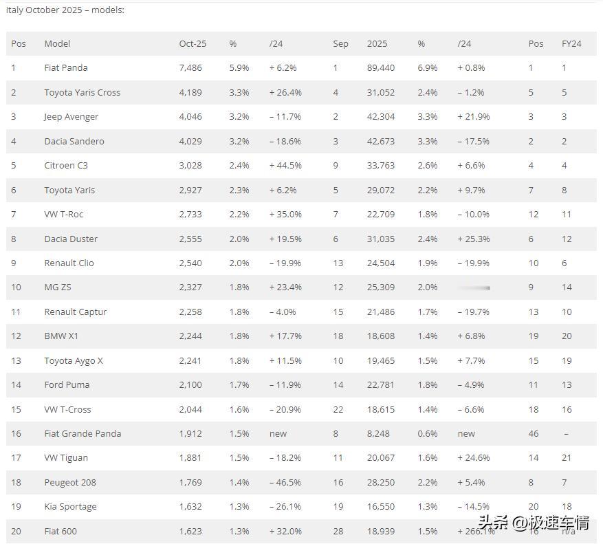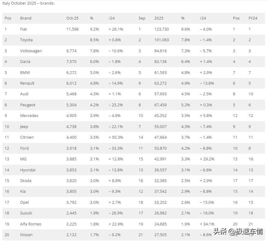 十月,意大利车市同比下降0.6%。电动化(BEV+PHEV)车型迎来暴增,同比激增124.9%,至9,833 辆,份额从3.4%升至7.7%。名爵增幅显著;奇瑞Omoda&Jaecoo、比亚迪保持同比暴增;三家车企带领中国品牌继续渗透意大利市场。 2025年10月,意大利新车销量同比下降0.6%,至125,826辆。 2025年1-10月,意大利累计销量同比下滑2.7%,至1,293,366辆。 中国品牌表现出色: 名爵:3885辆,第13名,市占率3.1%。名爵ZS(+23.4%)回到第十,保持中国品牌车型在头部阵营的存在感。 比亚迪:1868辆,市占率1.5%。 奇瑞Omoda&Jaecoo:2835辆,市占率1.5%。 DR:旗下DR、EVO、SportEquipe是贴牌的奇瑞、江淮、凯翼、北汽等中国品牌,销量1762、744、251辆,市占率1.3%、0.6%、0.2%。 零跑:288辆,市占率0.2%。 东风小康:125辆。 领克:84辆。