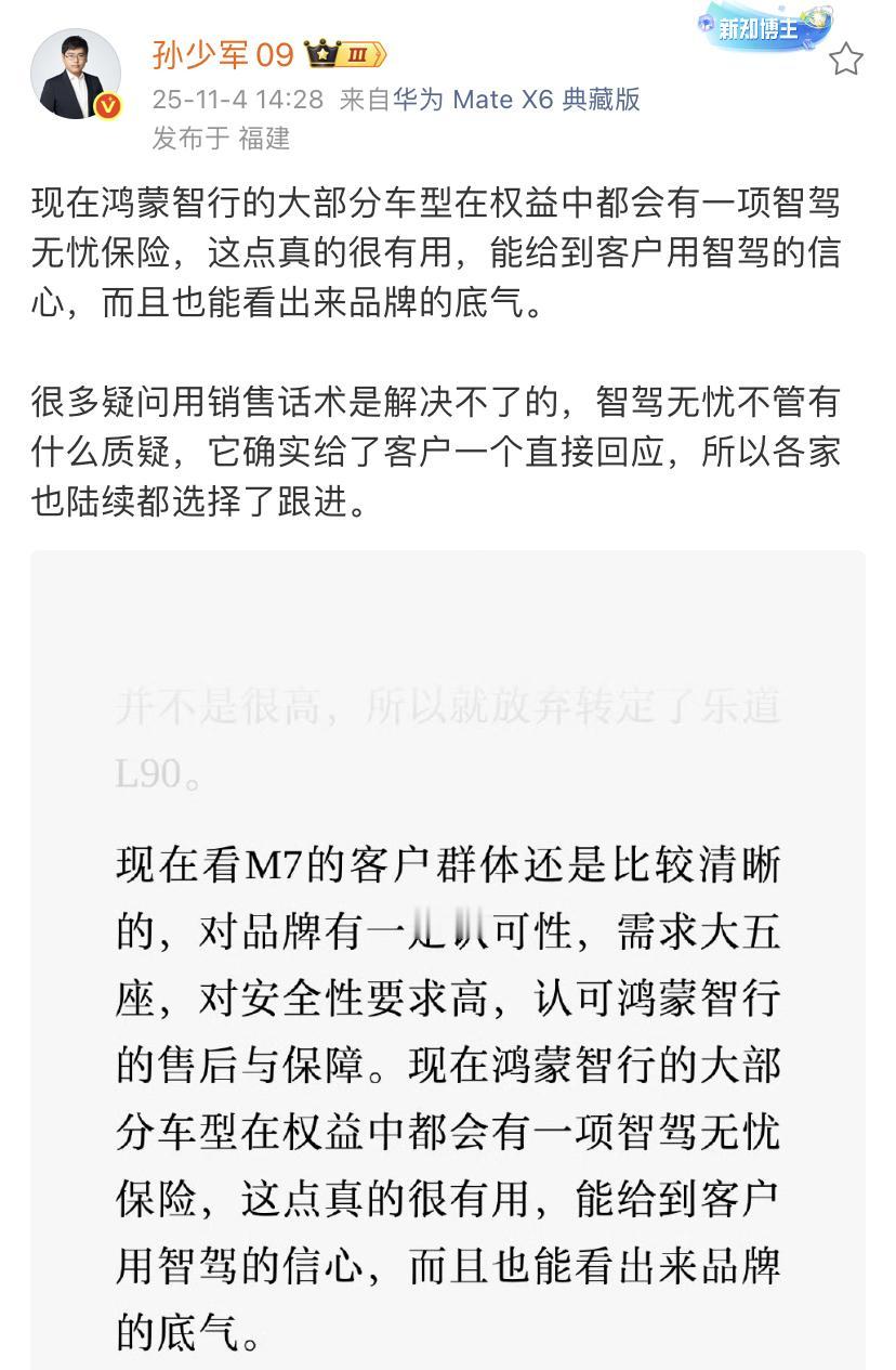 孙少军:鸿蒙智行车辆中有一个叫智驾无无忧保险,就是保障在智能驾驶过程中发生的事故的赔偿! 智能辅助驾驶虽然功能很强大,但是也不是可以保证100%避免事故的发生。在事故发生的时候,有一份保险能够承担赔偿损失,这个东西确实给了消费者使用的底气。 各位是怎么看的?欢迎评论区留言。