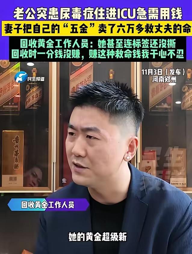 看哭了!在河南郑州,一位女子走进金店,打算卖掉结婚时的“五金”。店主见那黄金崭新无比,便劝女子把黄金拿回去,告知日后还能升值。谁料女子道出缘由后,店主深受触动,最终以高价将黄金收走。 店主看到黄金时满是疑惑,毕竟黄金新得连标签都没撕。他好心劝女子把黄金留着,可话刚出口,女子的眼泪就夺眶而出。女子哽咽着说:“我老公得了尿毒症,现在正躺在 ICU 里,我得拿这笔钱救他!” 这个故事着实令人动容,也引人深思。以下是一些感悟与分析: 女子为救丈夫,忍痛出售结婚时的黄金,尽显对家庭的担当与深情。她的泪水与话语,让人真切感受到那份无助中的坚强。 作为婚礼“五金”,黄金不仅是物质象征,更凝聚着家庭的幸福与回忆。女子愿用它换取救命钱,足见生命的珍贵远超物质。 店主听闻女子的遭遇后,深受感动,主动高价收购黄金。其善意与人性光辉令人钦佩,让我们看到困境中人与人之间的温暖与善良。 这个故事提醒我们,社会上有许多家庭在遭遇突发灾难时急需帮助。我们不仅要心怀同情,更应给予实际的援助与关怀。 生命无价,家庭的温暖与责任才是至关重要的。此故事呼吁大家关注身边的困难家庭,伸出援手,传递善意。 这是一个感人至深的故事,展现了人性中最美好的一面。也期望社会能多些关怀与帮助,让每个家庭在困境中都能感受到温暖与希望。
