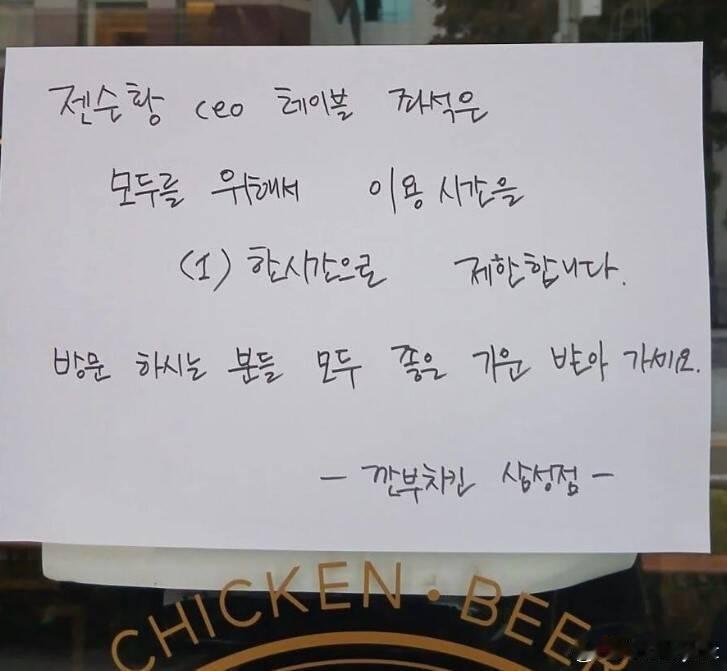 据《朝鲜日报》报道,这家位于首尔地铁三成站附近的 *Kkanbu Chicken* 门店负责人透露,自从黄仁勋等人光顾后,每天都有大量顾客点名要坐“黄仁勋桌”。由于现场排队人数过多、座位长期被占,店方不得不出台新规定——“黄仁勋桌”每组顾客限时用餐1小时,其余座位则不受限制。