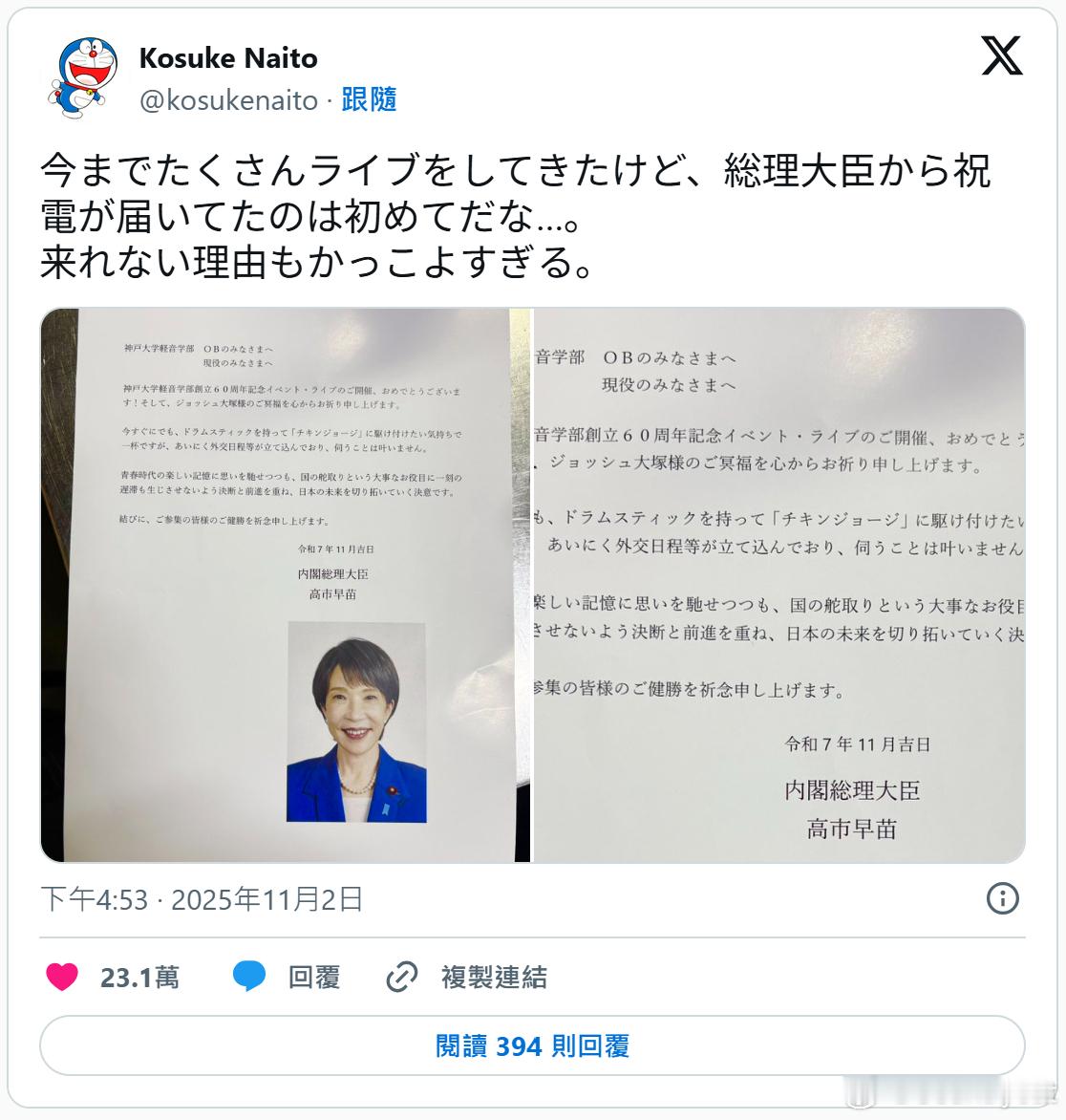 内藤在后续评论中提到,约20年前他在社团活动期间,每年定期演出都会收到高市的祝贺电文,并直言若有一天高市能带着鼓棒参加校友活动,那将是最棒的事情。