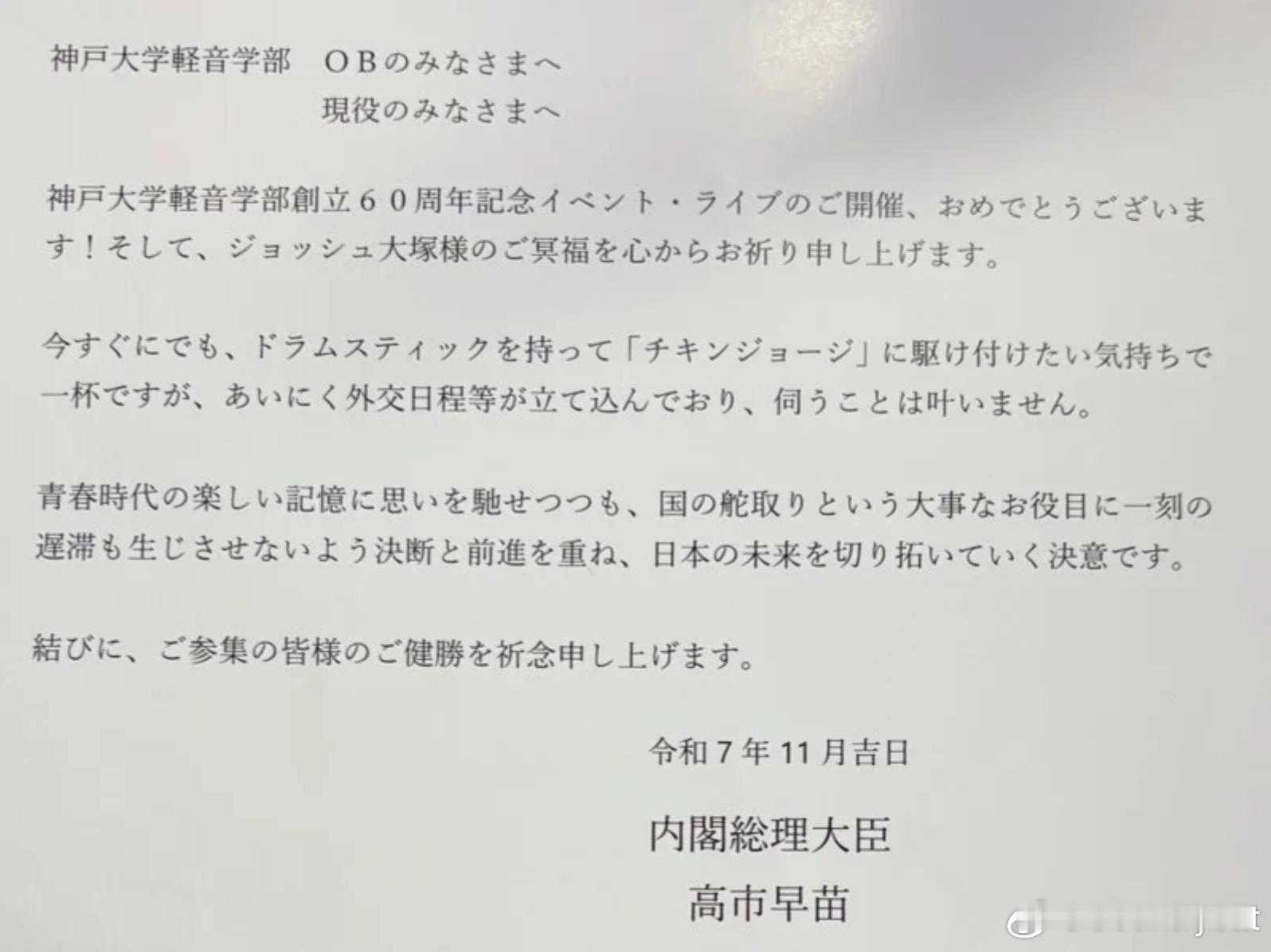 高市在电文中祝愿活动顺利举行,并再次提到因“外交行程繁忙”无法亲自出席。她同时流露对表演的热情:“我现在满脑子都是立刻拿起鼓棒、赶去Chicken George的冲动。”一句话勾起了大家对她重金属鼓手时期的回忆,也为整封信增添了摇滚气息。