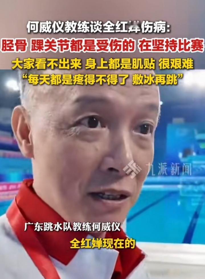 何威仪教练谈婵宝伤病:胫骨.裸关节都是受伤的,可她一直坚持比赛那些大包小包的都是肌贴,她真的非常的艰难,但是她从未放弃对跳水的热爱,一直坚持训练,这次能拿到冠军真的很不容易,你们永远也看不到她背后的努力,每次都是敷完冰贴继续起跳,作为国内顶级跳水运动员,荣耀的背后是坚持付出非普通人能承受的高强度训练。 不过对于有一定天赋的婵宝而言同样会面临体重身体发育等常见问题,可她乐观坚强的去面对任何一种挑战,为了团队在伤还没有完全康复的情况下参加比赛,而且还获得了金牌,真的让人佩服她的天赋与努力,连同伴都说和她一起比赛压力很大,荣耀的背后是无所日夜兼程的高强度训练,有几次教练都想让她多休息下,可她依然坚持练习,就是这样的决心恒心让她再一次站在舞台中央,接受掌声和鲜花的洗礼,只能说一句婵宝:你真棒。