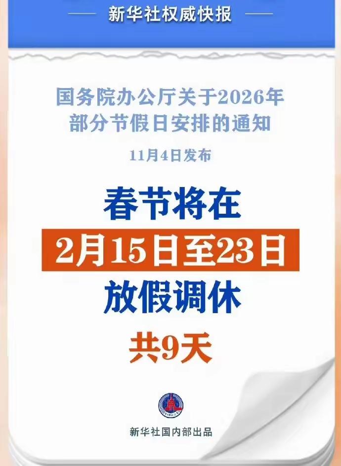 历史最长的春节假期出现了,它就是2026年的春节假期,一共休息9天,这可是给工作中的宝宝们一大福音,能痛痛快快在家玩9天,要是在工作中的宝宝们,三倍工资能拿到手软。 2026年的其他节假日也都出来了,国庆假期是7天,劳动节有5天,其他节假日均为3天,这是给我们劳动人民的一大福利,感谢伟大的祖国。