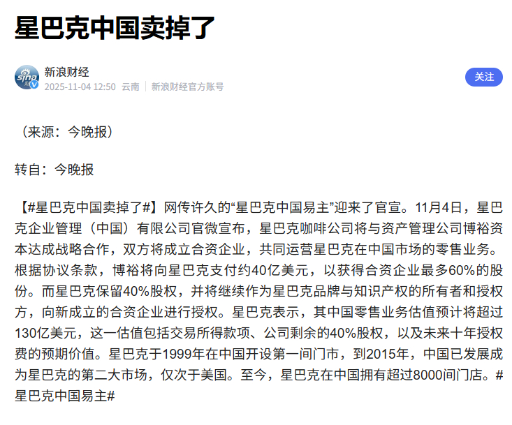 “星巴克中国卖掉了”,这个结论多少有点冒。星巴克确实将在华业务60%的股权卖给中国公司,但它仍握有40%的股权在自己手里,而且保留了对“星巴克”品牌的所有权。在新的合资公司里,中国博裕资本控股,但星巴克仍有存在感,这一调整很可能增加星巴克在中国市场的竞争力。同时,在多数中国消费者的眼里,它仍是美国品牌的咖啡店。中美公司的利益绑在了一起,美国的品牌继续保持它在中国市场上的余韵,这样的交流融合我觉得挺好的,它可以看成是全球化这条大河带来的又一块冲积平原。