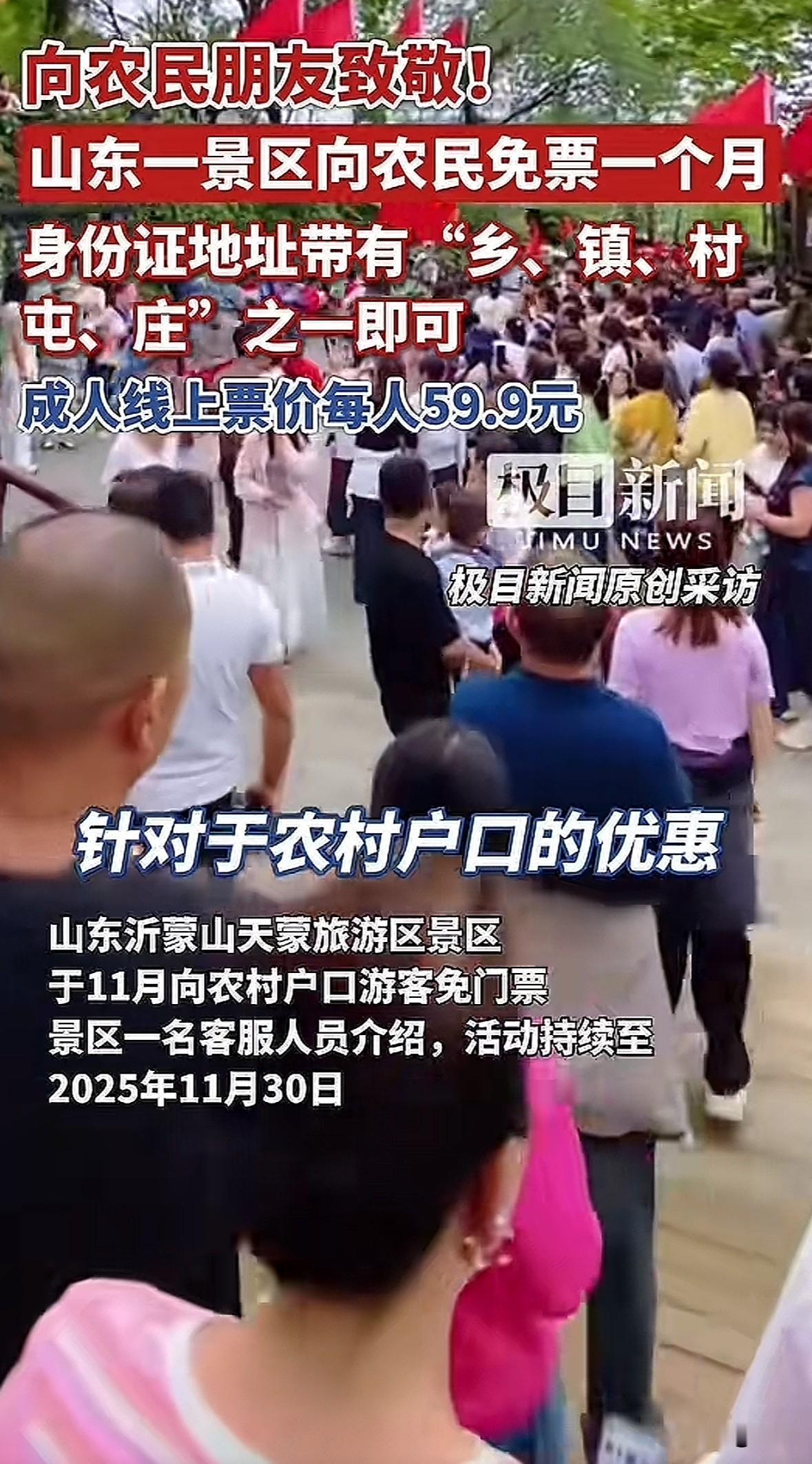 山东沂蒙山天蒙景区11月对全国农民免票一个月,身份证地址带“乡、镇、村、屯、庄”就能直接换票入园。今年北方雨水多,农民冒雨抢收粮食特别辛苦,景区这波操作是致敬耕耘者。 平时景区成人票59.9元,农民很少有机会逛景区,这次免票让他们能趁农闲赏秋景。既暖了农民的心,也给旅游淡季的景区带来人气,还带动周边农家乐生意。 农民守护大家的“粮袋子”,就该被好好对待。这种把人文关怀和经营智慧结合的做法特别好,不搞复杂流程,实惠直接给到农民。希望更多景区能跟上,让辛苦的劳动者多享点福利,这样的暖心活动就该多些。