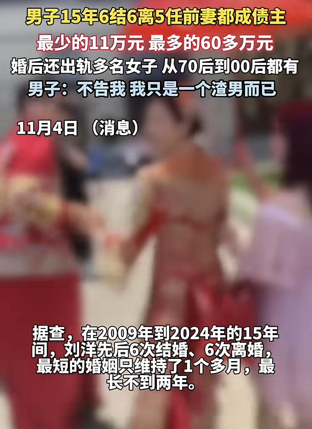 今年38岁的刘洋,多年来在婚恋市场频繁进出,前后经历了6段婚姻,最短的一段仅维持1个月,最长的也不过2年,如今均已离婚。而让这场“高频婚恋”彻底出圈的,是他离婚后竟欠下5位前妻的债务,最终被前妻们集体追讨,闹得人尽皆知。 刘洋的第一任妻子王女士,两人2012年结婚,婚后刘洋以“创业开餐馆”为由,向王女士借了8万元,还写下借条承诺一年后归还。可餐馆经营不到半年就因亏损倒闭,刘洋不仅没还钱,还以“性格不合”提出离婚。王女士念及过往情分,没立刻追债,没想到这成了后续债务纠纷的开端。 第二任妻子李女士,2015年与刘洋结婚,彼时刘洋声称要“投资房产”,说服李女士拿出婚前积蓄12万元,还让她以个人名义向银行贷款5万元,约定房产增值后两人平分。可刘洋拿到钱后并未买房,反而挥霍一空,李女士发现后提出离婚,刘洋写下17万元的合并欠条,却始终以“没钱”为由拖延。 后续的第三、四、五任妻子,也都遭遇了类似情况。第三任张女士被借6万元用于“装修婚房”,结果婚房没装,钱被刘洋用于网络赌博;第四任赵女士被借10万元“做工程”,实则刘洋根本没承接任何项目,资金全用于个人享乐;第五任陈女士更惨,不仅被借走5万元,还被刘洋哄骗担任其名下空壳公司的监事,后续公司因欠债被起诉,陈女士也被牵连。 第六段婚姻仅维持3个月便破裂,第六任妻子孙女士因察觉刘洋负债累累且毫无还款意愿,果断止损离婚,所幸未产生大额借款。而此前的5位前妻,多年来多次联系刘洋催债,他要么失联,要么找各种理由推脱,甚至拉黑前妻们的联系方式。 2023年底,王女士偶然联系上其他几位前妻,才发现大家都被刘洋以不同名义借钱,涉及金额合计近50万元,且均有借条或转账记录。忍无可忍之下,5位前妻抱团维权,先是向当地社区和派出所反映情况,随后联合向法院提起诉讼,要求刘洋归还全部欠款。 目前,法院已受理该案,刘洋因涉及多起债务纠纷,名下仅有的一套房产已被查封。这场荒唐的“六结六离”,最终以债务缠身、名誉扫地收场,也给不少人敲响了警钟:婚恋中需警惕“高频离婚者”的财务陷阱,涉及金钱往来务必留好凭证,避免自身权益受损。