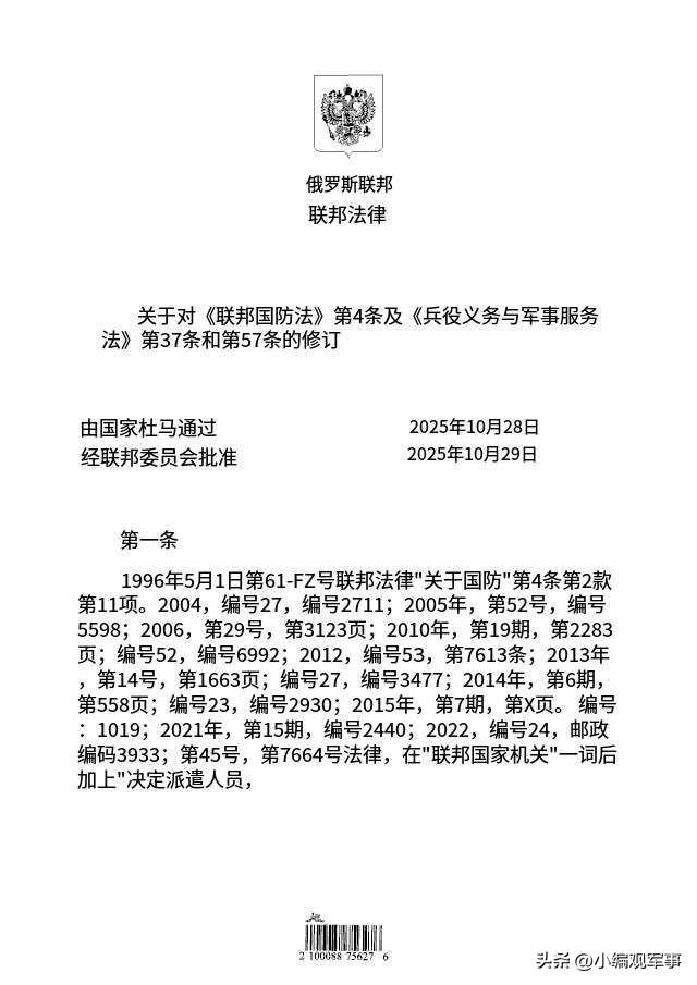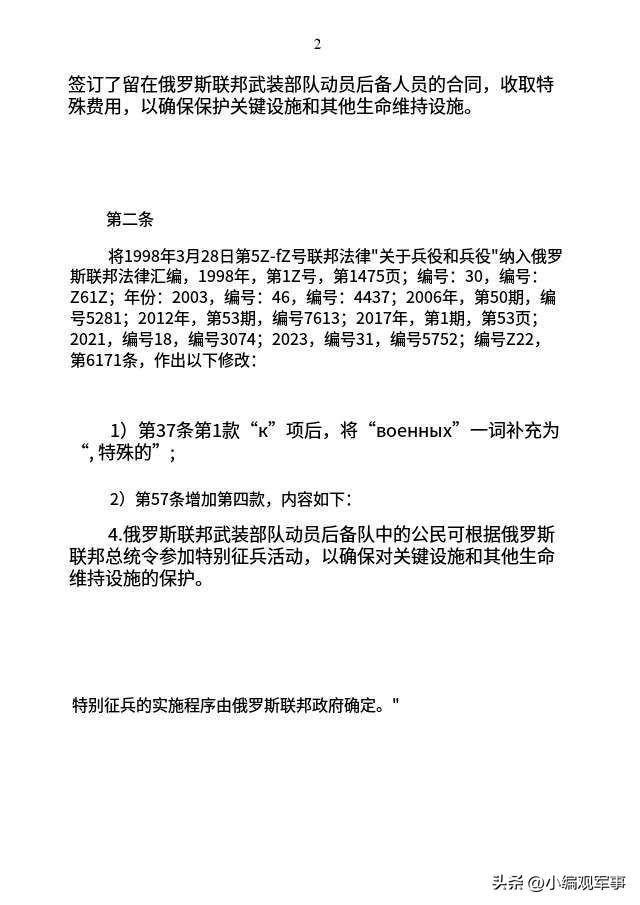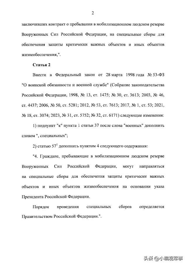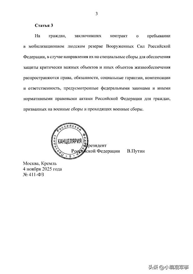 🇷🇺俄罗斯总统普京签署了一项法律,规定可以派遣预备役人员参加特别集训,以保护能源、交通、炼油厂及其他基础设施的安全——仅限于其所在地区内,相关文件已发布在官方法律文件发布网站上。 该法律规定,可以派遣处于俄军动员人力储备状态的公民参加特别集训,以确保关键重要设施及其他生活保障设施的安全。 特别集训的具体实施办法将由俄罗斯政府确定。 同时,对于签订了俄军动员人力储备合同的公民,在被派遣参加特别集训以保障关键重要设施及其他生活保障设施安全时,将享有联邦法律及其他俄罗斯规范性法律文件规定的权利、义务、社会保障、补偿及责任,这些规定同样适用于被征召参加军事集训并正进行军事集训的公民。 俄罗斯征兵 新俄罗斯计划 乌军动员 军人预备役 军事训练动员 俄罗斯扩充兵源 预备役人员