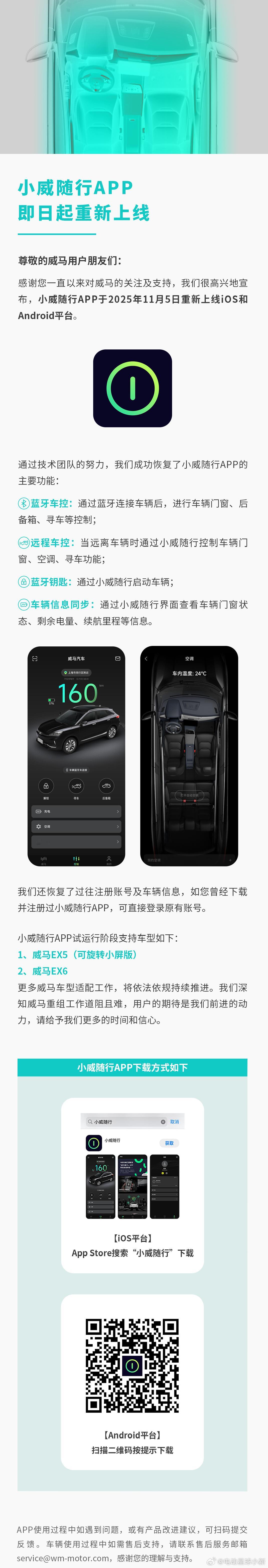 恢复了蓝牙车控、远程车控、蓝牙钥匙、车辆信息同步功能,试运行阶段支持威马 EX5(可旋转小屏版)和威马 EX6。