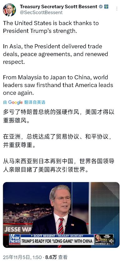 美国财长贝森特今天(北京时间11月5日)发文写道:“多亏了特朗普总统的强硬作风,美国才得以重振雄风。在亚洲,特朗普总统达成了贸易协议、和平协议,并重获尊重。从马来西亚到日本再到中国,世界各国领导人亲眼目睹了美国再次引领世界。 先说说他吹上天的贸易协议,指的肯定是那个臭名昭著的“第一阶段”经贸协议。特朗普当时搞得轰轰烈烈,好像自己赢了全世界,逼着中国承诺买两千亿美元的美国货。 结果协议签了,可中国根本没按他的剧本走。疫情一来,全球供应链全乱了,中国想买也买不了那么多。美国人以为能靠这个协议把中国拿捏住,最后发现只是自导自演了一出独角戏,美国的农民还在等着中国的大豆订单,等得花儿都谢了。 紧接着他又提“和平协议”,这更是让人摸不着头脑。特朗普在亚洲到底促成了什么和平?朝鲜问题?他倒是跟金正恩见了三次面,手也握了,照片也拍了,可朝鲜的核武器一枚没少,试验场后来还给恢复了。 这叫和平吗?这叫作秀。他以为靠个人魅力就能搞定几十年都没解决的难题,结果就是雷声大雨点小,除了给历史留下一堆合影,啥实际成果都没有。 至于“重获尊重”,那就更搞笑了。特朗普在亚洲搞的是“美国优先”,不是“亚洲优先”。他动不动就退群,威胁要加关税,把盟友当冤大头。日本和韩国被他逼着交更多的“保护费”,心里能舒服吗? 马来西亚这些东南亚国家,更是被他搞得一头雾水,不知道美国到底想干嘛。这种做法换来的不是尊重,是警惕和疏远。大家表面上客客气气,背地里都在想办法减少对美国的依赖。 贝森特还特意点了中国的名,说中国领导人亲眼目睹了美国再次引领世界。这话说得可真有勇气。特朗普执政那几年,中美关系掉进了冰窟窿。贸易战打得天昏地暗,科技封锁一轮接一轮,两国之间的信任几乎被消耗殆尽。 中国非但没有被压垮,反而在压力下加快了自主创新的步伐。现在看看,中国的5G、新能源汽车、人工智能,哪个不是在那个时候加速发展的?美国想卡脖子,结果逼着中国把自己的脖子练得更粗了。 美国在亚洲的领导力,不是靠几句狠话就能重建的。真正的领导力,是提供公共产品,是帮助地区发展,是维护稳定。 特朗普干了啥?他退出了TPP,把一个本可以用来制衡中国的经济框架亲手给拆了。他让亚洲国家看清楚了,美国靠不住,关键时刻只会想着自己的利益。结果呢?RCEP,也就是区域全面经济伙伴关系协定,反而趁势而起,成了全球最大的自贸区,里面可没有美国。 贝森特现在吹捧特朗普,无非是想给现任政府脸上抹黑,顺便给自己的政治前途铺路。他把特朗普的胡搅蛮缠说成“强硬作风”,把破坏规则说成“重振雄风”,这种颠倒黑白的本事确实了得。 但事实胜于雄辩,特朗普留下的不是一个更强大的美国,而是一个更加分裂、信誉更加受损的美国。亚洲国家看在眼里,记在心里,谁还会真心实意地跟着一个随时可能“退群”的领导者走? 所以,贝森特的这番表态,更像是给特朗普唱的一曲赞歌,而不是对现实的客观描述。他试图用华丽的辞藻掩盖特朗普时期外交政策的失败,但亚洲各国领导人的眼睛是雪亮的。他们看到的不是一个引领世界的美国,而是一个越来越不可预测、越来越自私自利的美国。 这种所谓的“尊重”,恐怕只存在于贝森特和特朗普的想象之中。现实世界里,大家都在忙着找新的合作伙伴,构建新的平衡,谁还把宝全押在美国身上?
