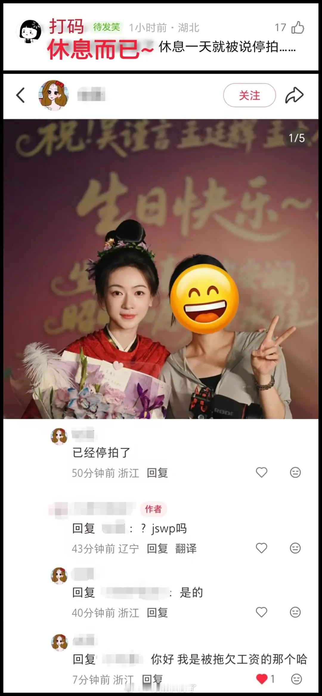 《江山为聘》剧组是停拍了还是只是休息一天,工作人员说是因为拖欠工资停拍了?[柯基]