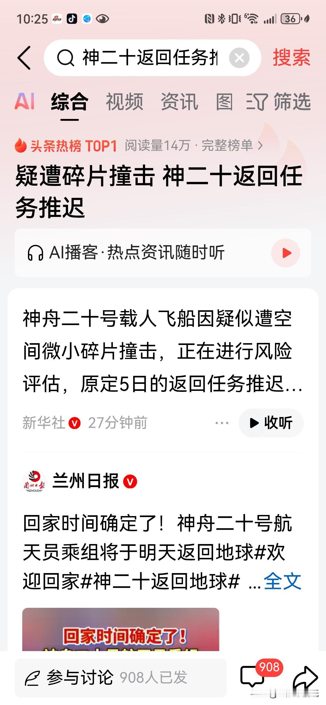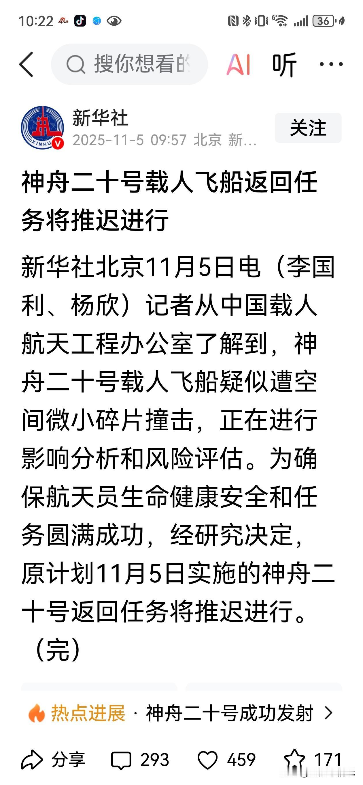 突发!原定今晚回家的神舟二十号飞船,竟遭空间碎片撞击归期延迟! 这些以每秒数公里飞行的太空垃圾,堪称轨道上的“隐形子弹”。专家正紧急评估防护罩受损情况,全力守护航天员回家路。 每一次变轨规避都在刷新航天防护标准——中国航天绝不打无把握之仗,必须确保我们的英雄百分百安全回家!静候凯旋!