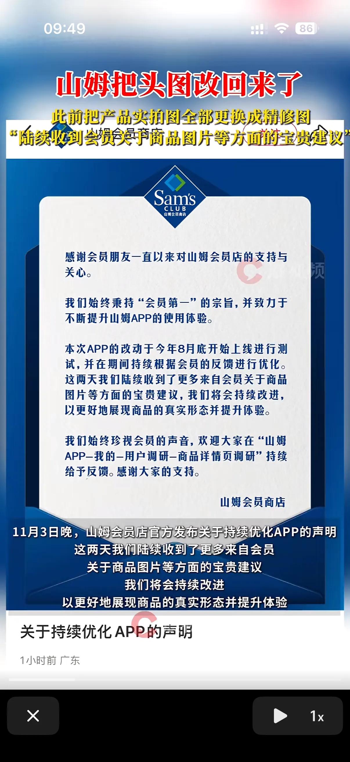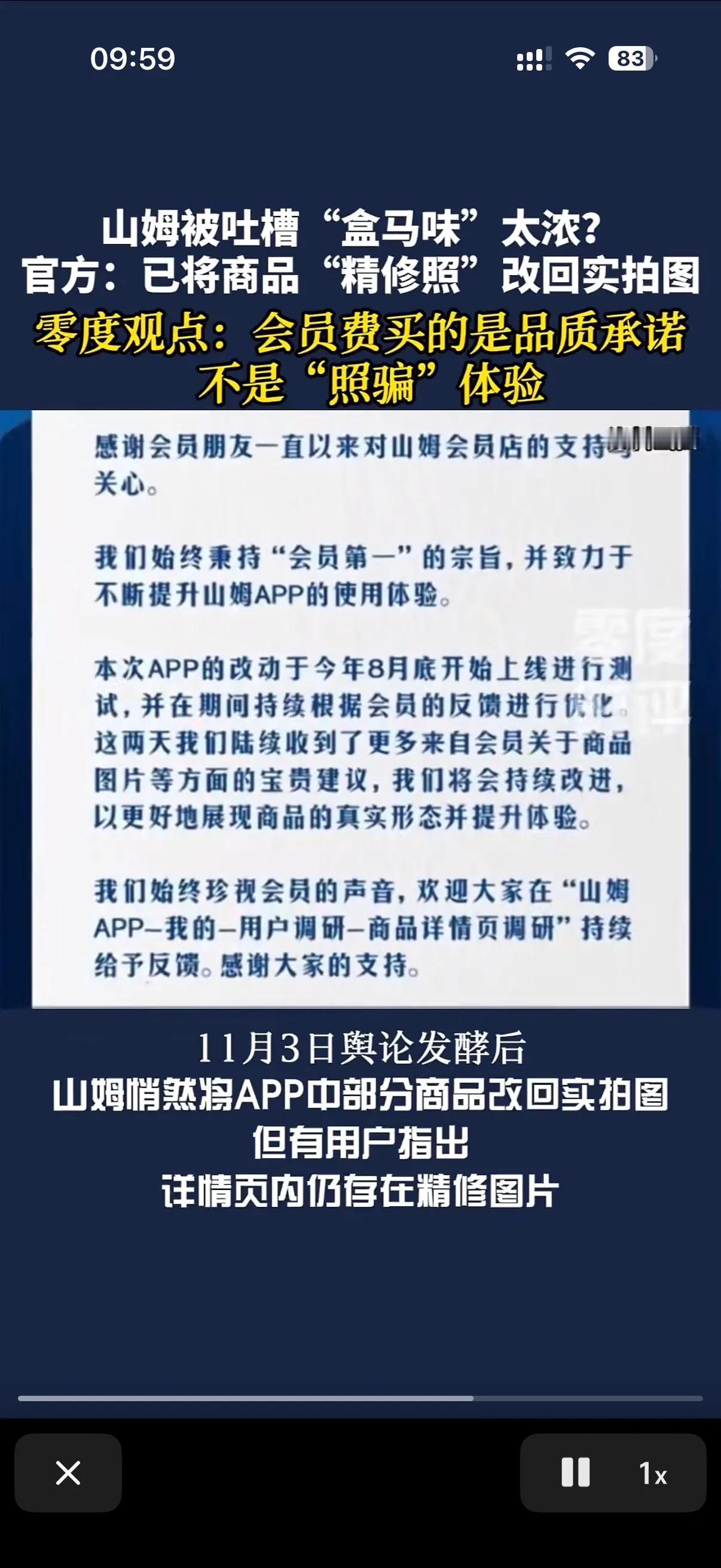 山姆又翻车了!你本可以不用10点这么晚还发公告的! 前两天山姆新官上任三把火!直接把山姆app的头图和商品的图片全从实拍图片变成了精修图片! 这下直接让山姆会员很生气!要知道之前山姆下架大家喜欢的优惠商品就引起山姆会员的不满了! 现在你连图片都用精修图片来忽悠人了,山姆的会员们选择山姆就是因为山姆的图片是实拍的,大家所见即所得!现在你用精修的图片大家还怎么做参考选择! 然后不出意外的山姆又翻车了,山姆看大家对新的改动很不满,就赶紧改回原来的图片,原以为自己这样主动会让自家会员满意! 但是一句你原本可以不用10点还发公告的说法,一下子引起了所有打工人的共情!山姆的小程序和直播间直接被网友攻陷刷屏,集体声讨要山姆辞退阿里来的高管,现在网上流传着要去阿里话,反对内卷文化! 看来山姆这次要在山姆会员和阿里高管做出选择了!