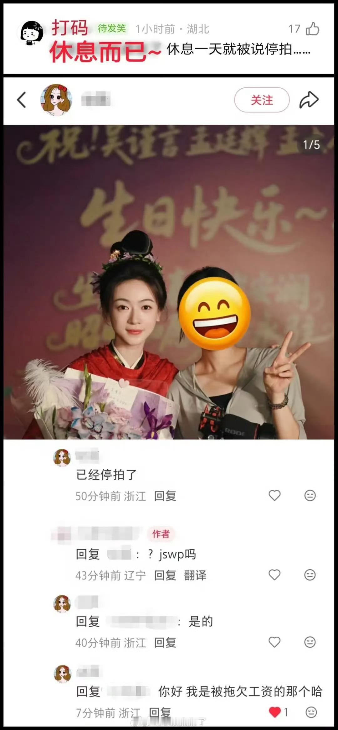 江山为聘停拍啦??? 剧组是停拍了还是只是休息一天,工作人员说是因为拖欠工资停拍了?[柯基] 于正的这个意思是不是说明吴谨言《江山为聘》这个剧组真的停拍了?[融化][融化]