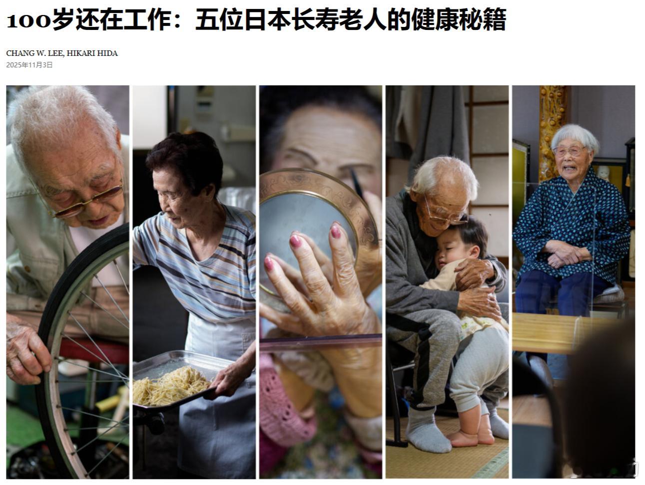 纽约时报:100岁还在工作,五位日本长寿老人的健康秘籍。103岁还在修自行车的石井、102岁还在做拉面的天川女士、101岁还在种地的松尾、102岁还在给别人做美容的堀野女士、101还在说书的小野知世端女士。