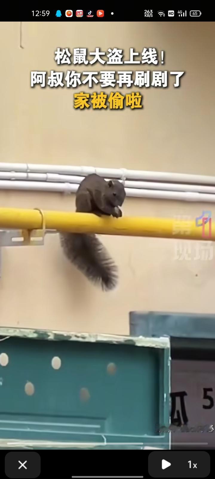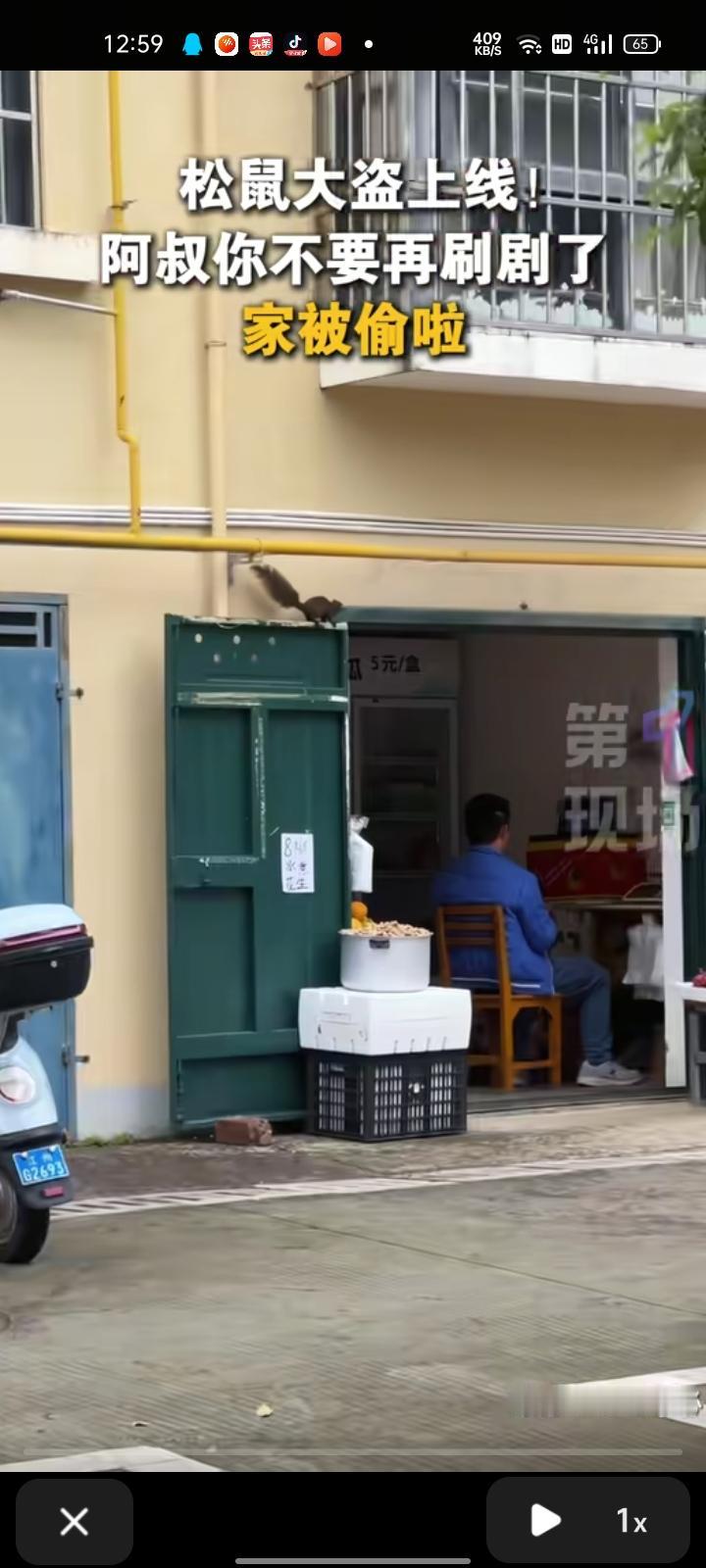 11月4日,广西崇左。网友发视频称,教职工宿舍的水果摊老板在认真刷剧,小松鼠停顿观察过后,就下去偷了一些花生,老板丝毫没注意到。学校生态特别好,有不少小动物