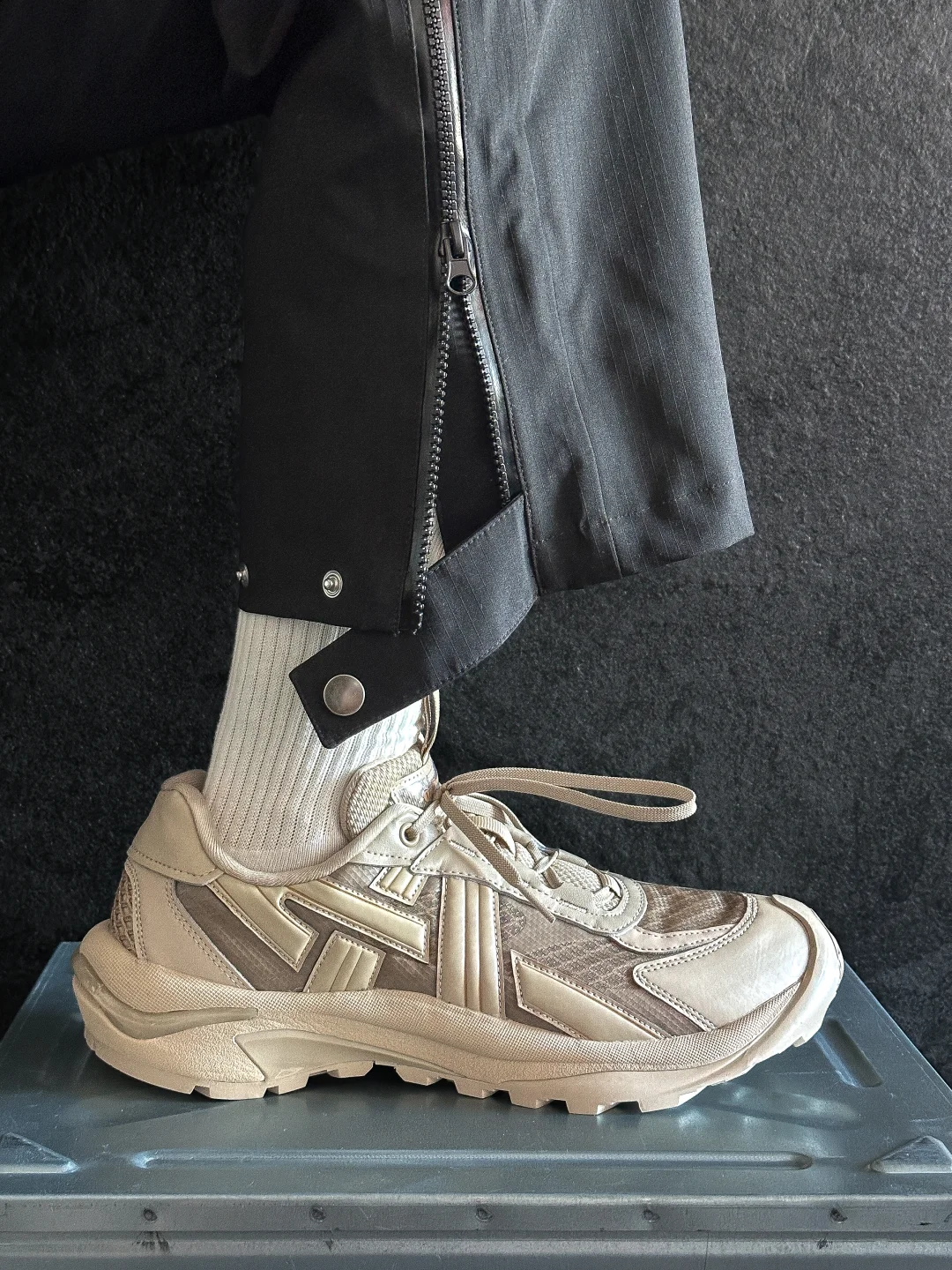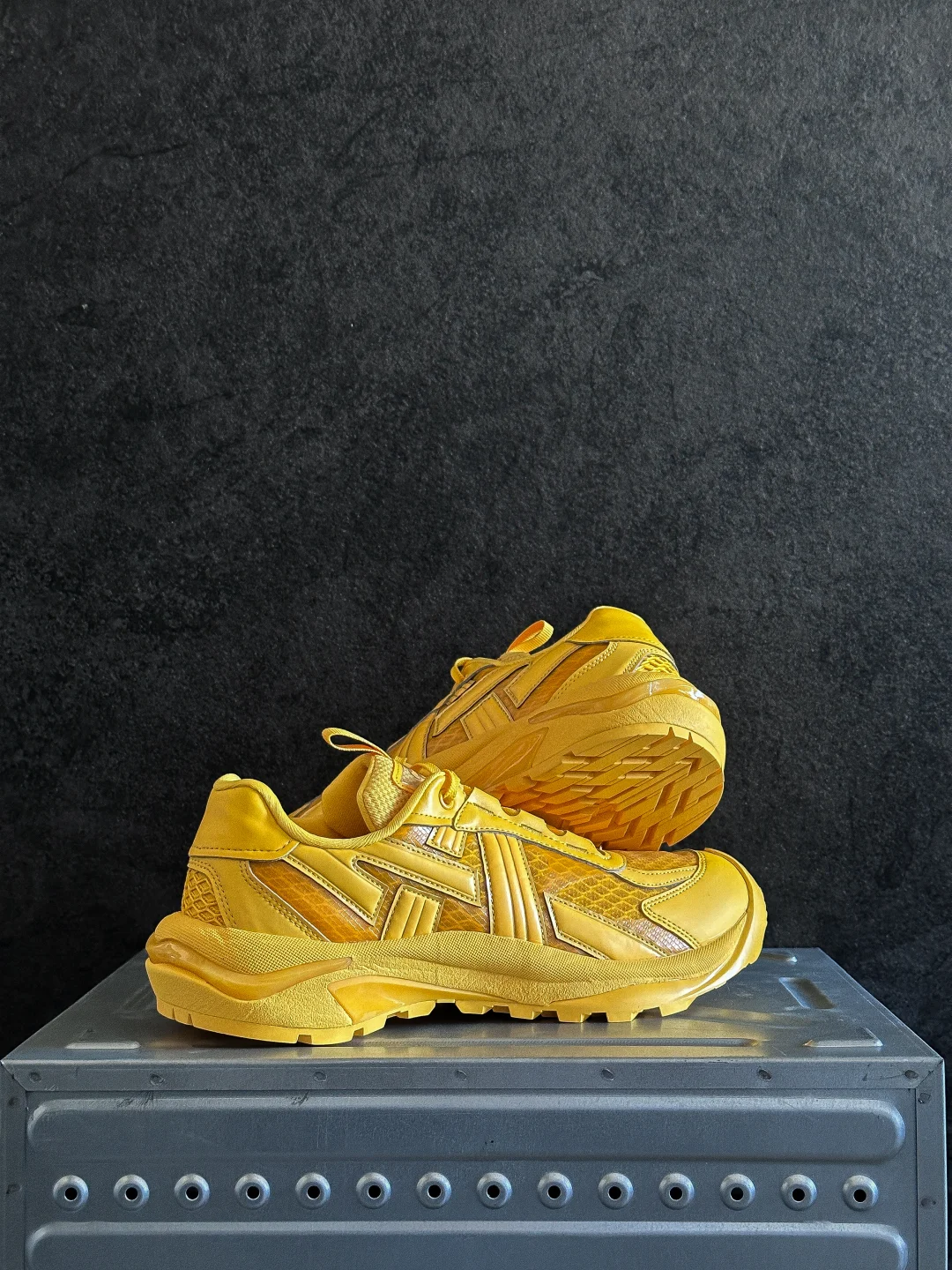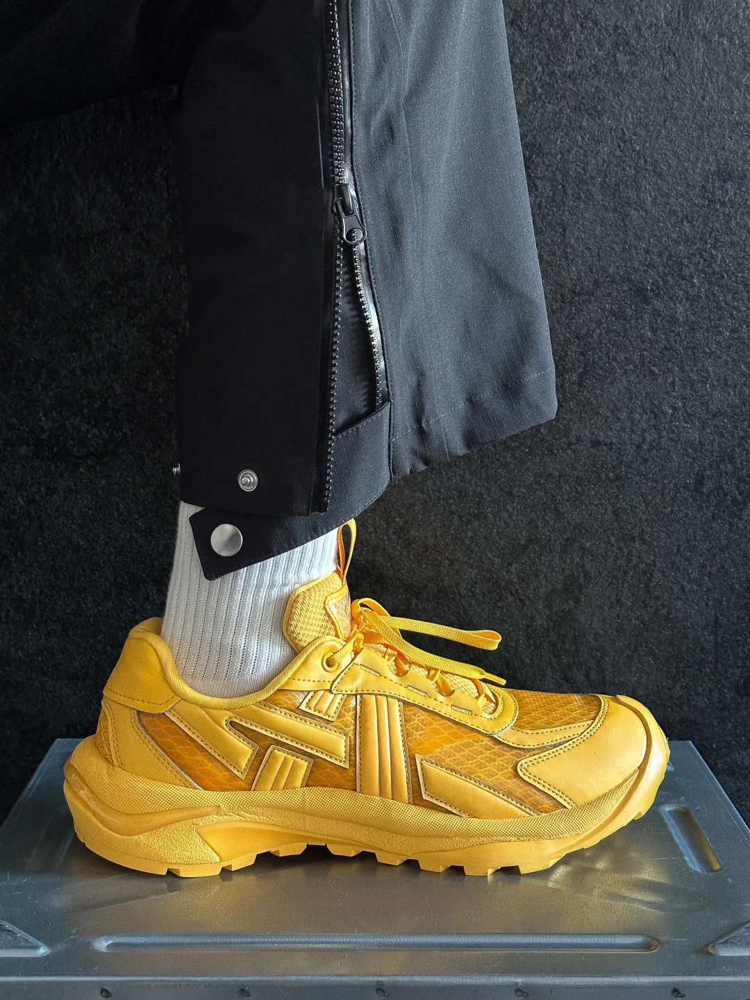 鞋身轮廓利落有张力,上翘的大底很有造型感。把越野跑鞋的运动感和时尚感平衡得很好,视觉上很有辨识度。