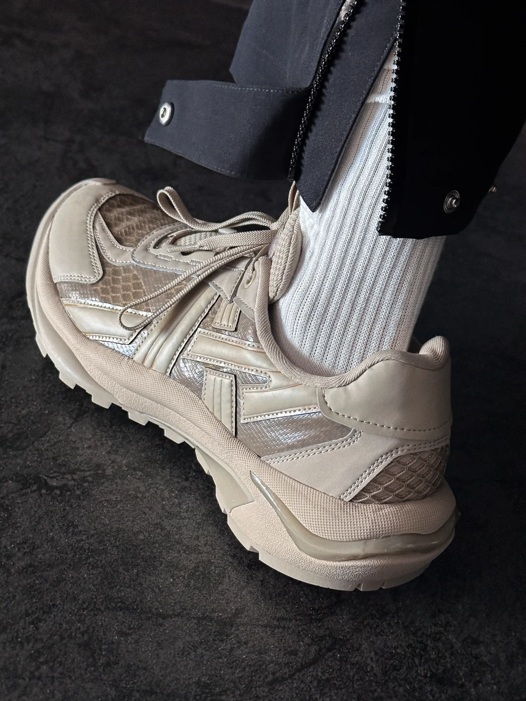 鞋舌与鞋面一体的半袜套结构,贴合脚腕舒适的同时又有效防沙石,很显利落。