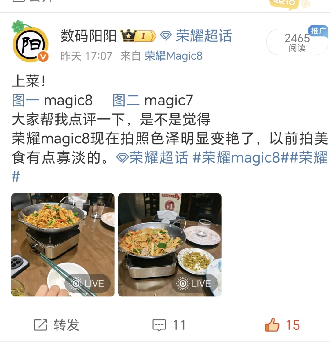 荣耀李健恐怕早就已经想好了这样做的后果!Magic8被黑子给包围了,真的有这么差吗? 我现在买手机几乎不看网上说的了,不知道有多少人和我一样的,别人说的评价翻来覆去就那几句话,但真正的体验好不好是真的不是短短几句就能描述出来的。关键这些人批评的点明眼人一看就很双标,这才上市几天呀?就能看出滞销了?还有说提升不大的,说白了这些话就是万金油。 荣耀magic8我上手三天了,就这个手感我感觉比我的magic7还要轻,但实际上一个是205克一个是199克,这你敢信吗? 之所以会有这种错觉,我认为主要原因是荣耀magic8这次用上了航天铝合金边框,加上机身尺寸略微缩小,电池变大,重量更加平衡造成的。 雪域白外观质感没怎么变,后盖玻璃更细腻,说它是男女通鲨一点也不过分。除了质感好,拍照这下也优秀起来了,昨天我还在wb分享了两张美食对比的照片,明显magic8的色彩表现更佳。 拍照硬件是旗舰级,主摄5000万像素1/1.56,超广角5000万像素,潜望长焦6400万像素3x光变加AI长焦算法,还有AIMAGI人像,灵感帮拍,AI修图,从拍照到后期修图调色一条龙服务。 系统MagicOS10更适合新手机,加上骁龙8Elite Gen5的高性能,120hz自适应刷新率,流畅度实际用的人最有体会!还有AI离焦护眼芯片2.0,高频pwm2.0,圆偏振光护眼2.0,像我这种常年需要手机工作的人真的救了老命。7000mAh青海湖电池续航,90w有线80w无线,顶部NFC全向天线,1216双扬声器,升级了IP68IP69K防尘防水,巨犀玻璃如果有了这么多你还说它没升级。 那我只能说,因为荣耀一开始就明牌没有挤牙膏。